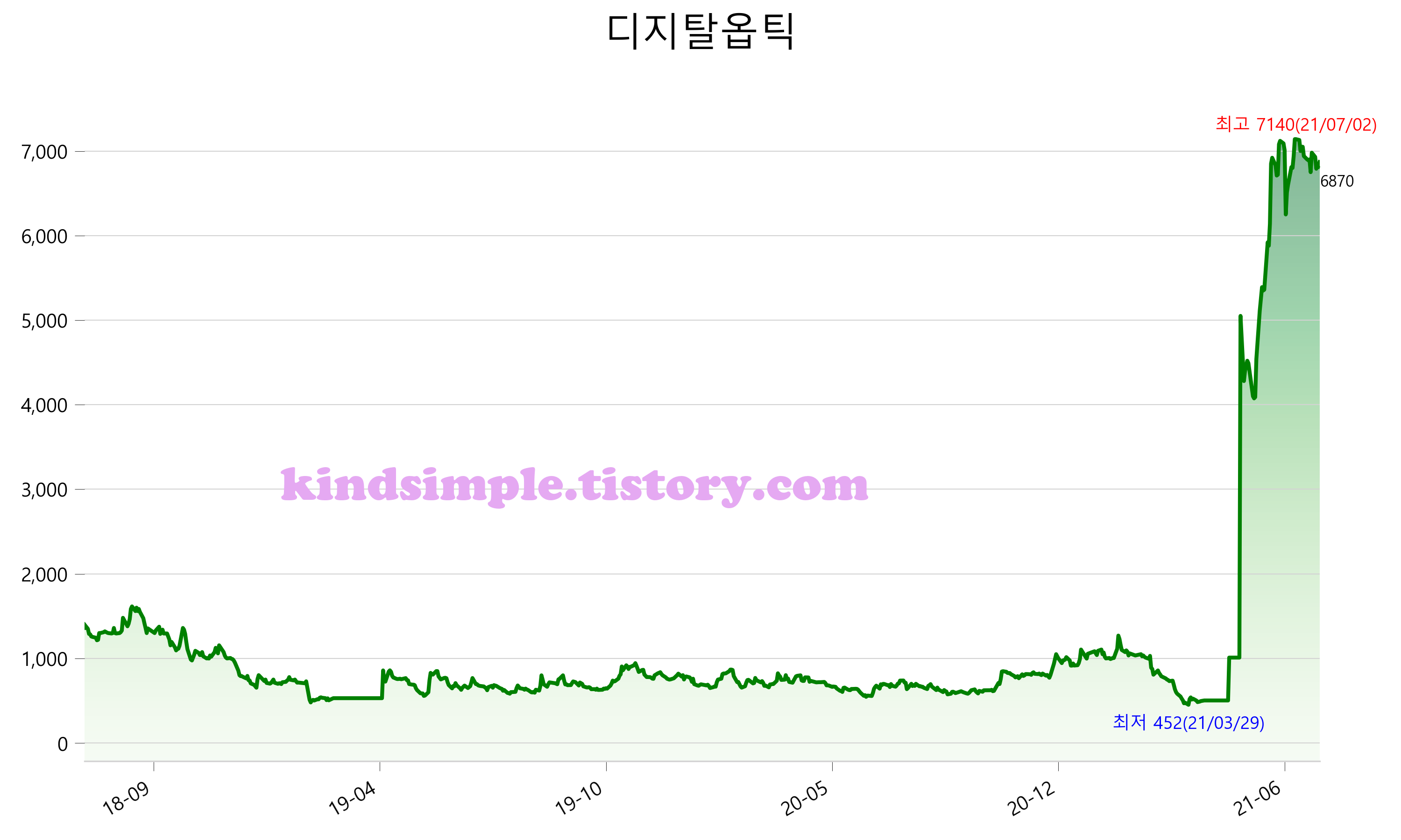 52주 최고가는 7,140원(2021-07-01), 52주 최저가는 452원(2021-03-29)으로 52주간 변동률은 881.4% 입니다.