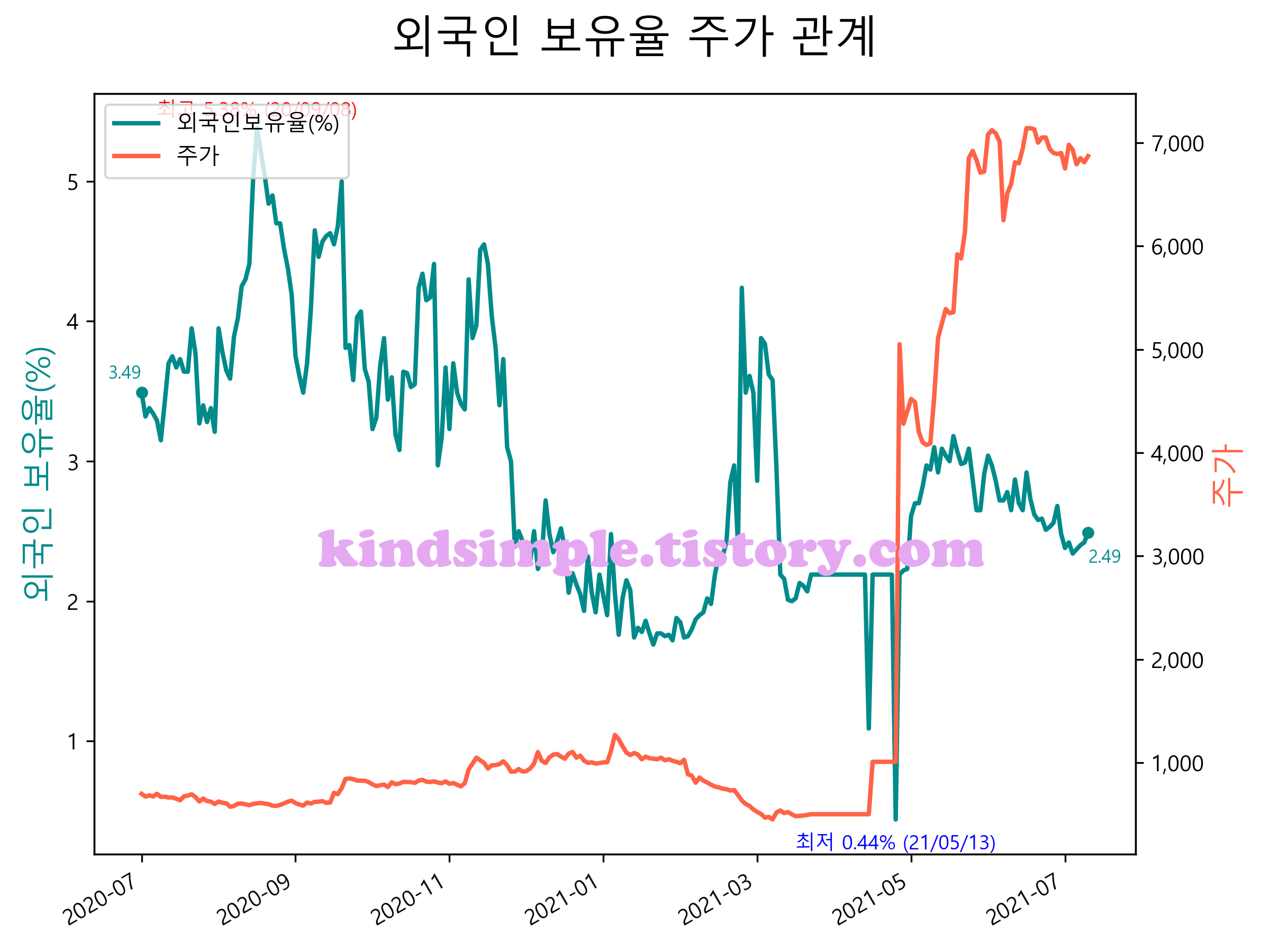 최근 1년간 외국인 보유율 및 주가와의 관계입니다.
