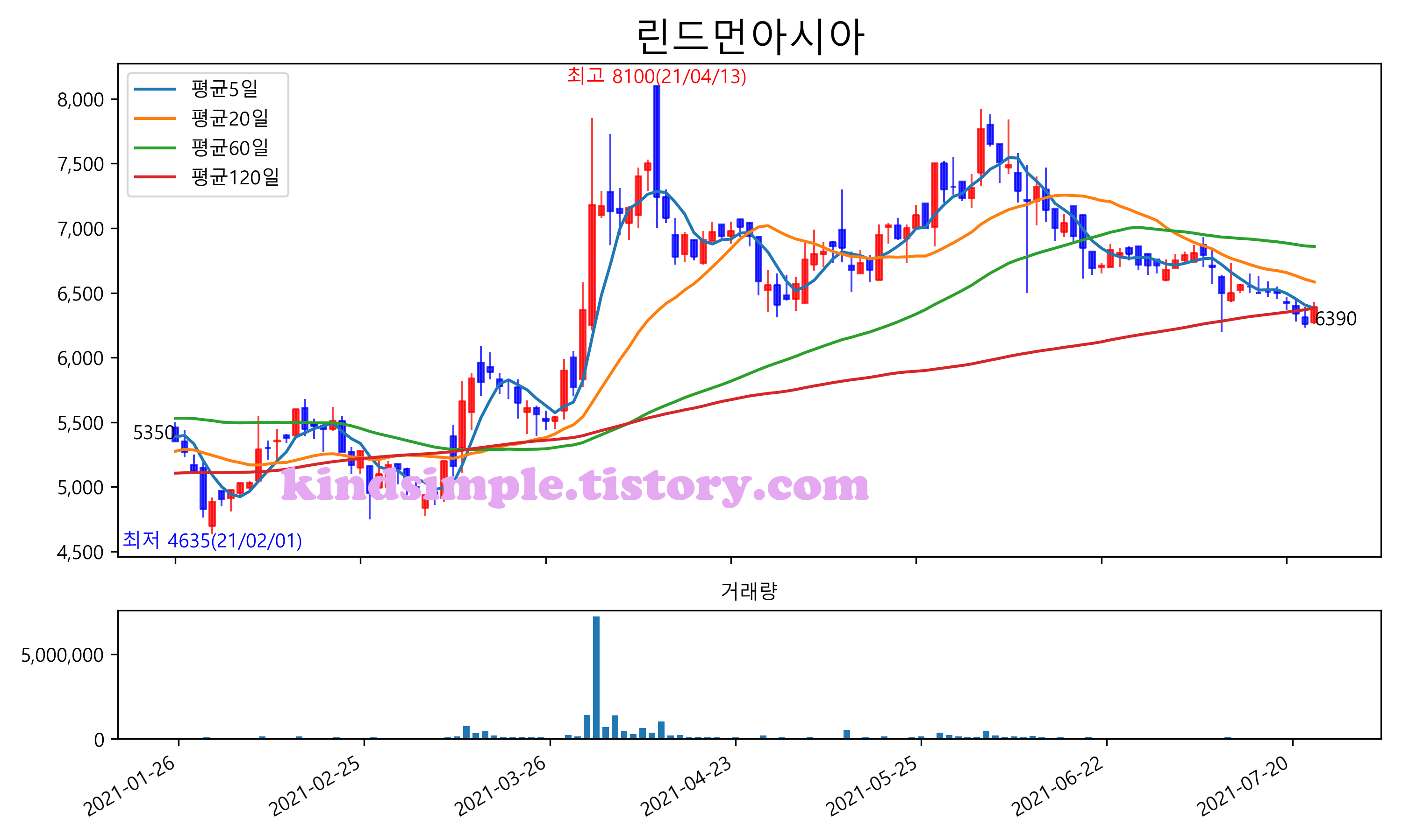 최근 6개월간 캔들차트 및 이동평균선입니다.