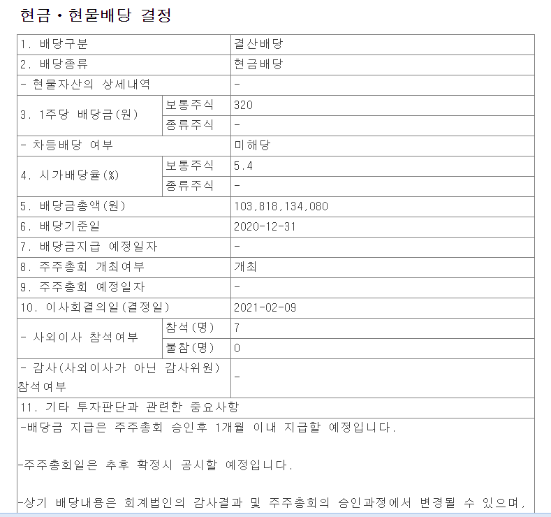 보통주는 320원이 배당되며, 시가배당율은 5.4% 입니다. 배당금 총액은 1,038억원 규모입니다.