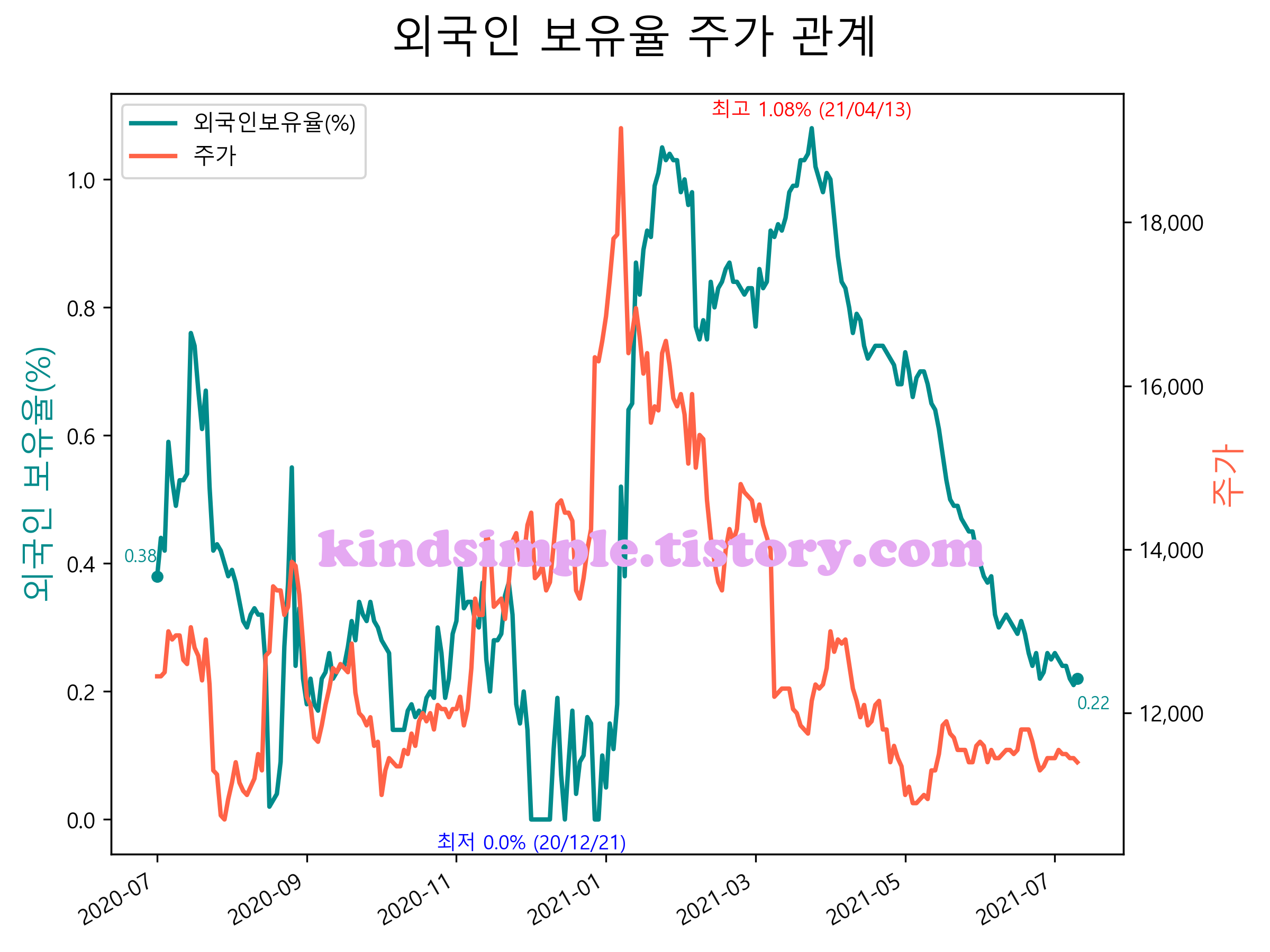 최근 1년간 외국인 보유율 및 주가와의 관계입니다.