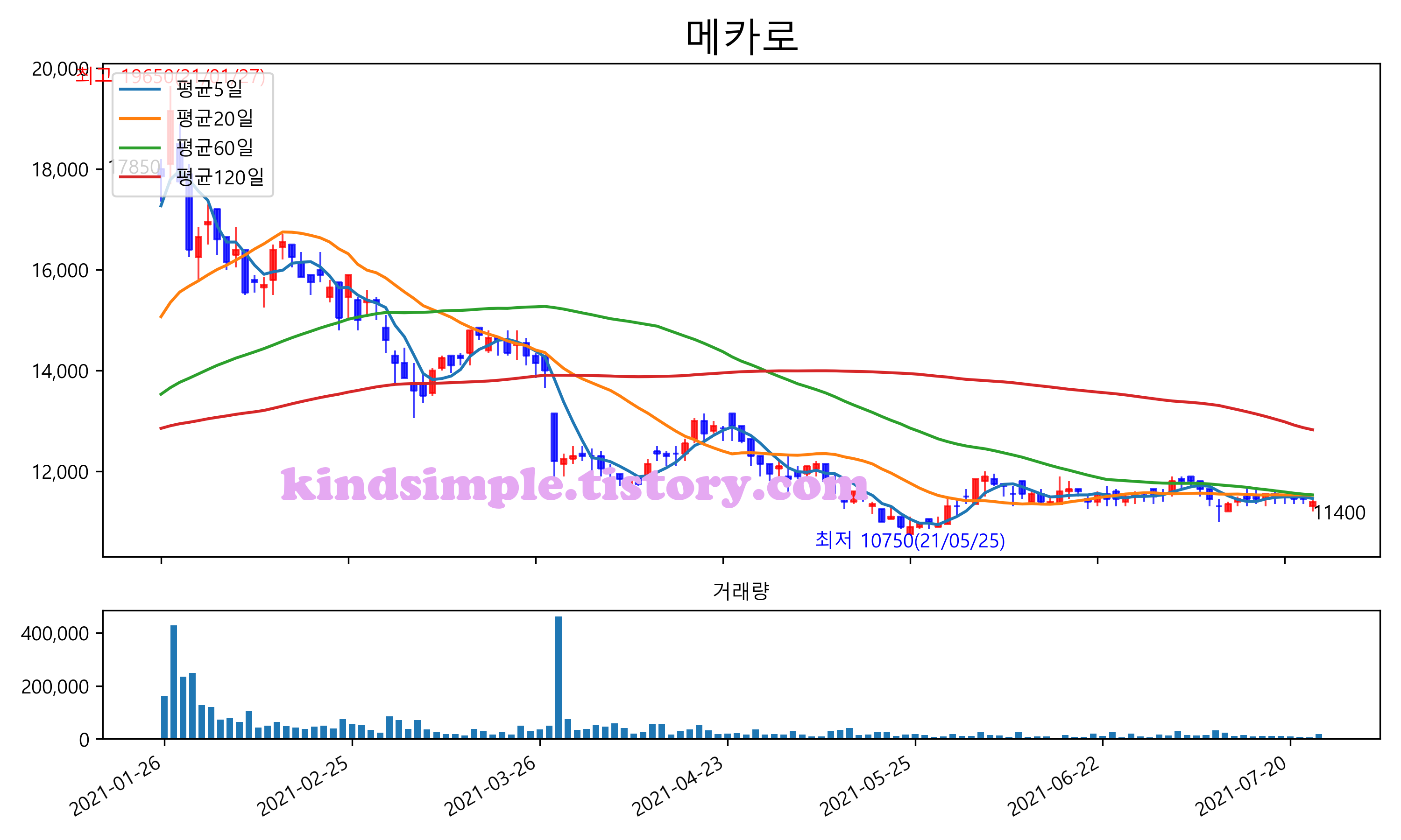 최근 6개월간 캔들차트 및 이동평균선입니다.