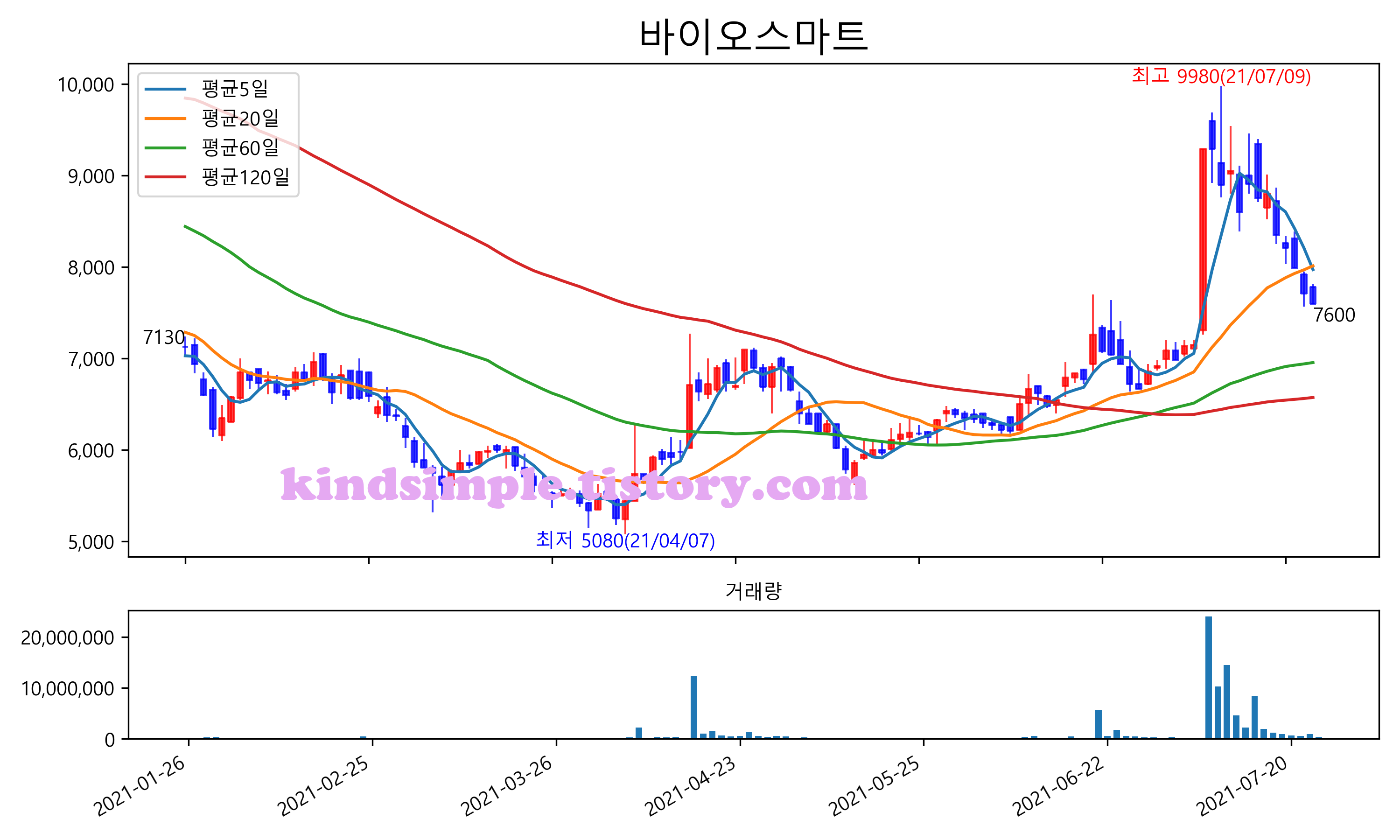 최근 6개월간 캔들차트 및 이동평균선입니다.