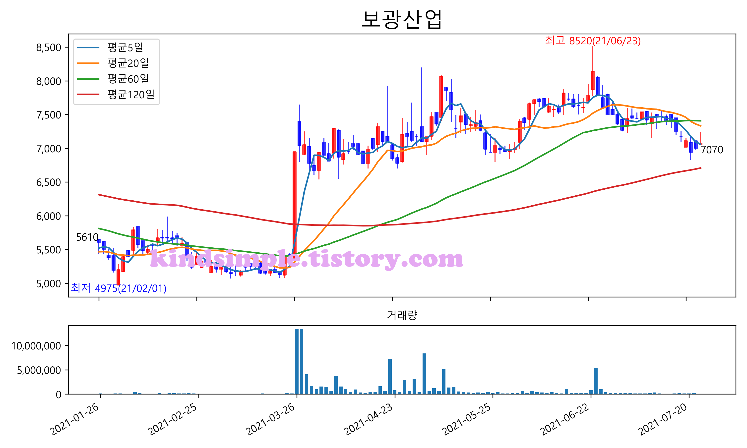 최근 6개월간 캔들차트 및 이동평균선입니다.