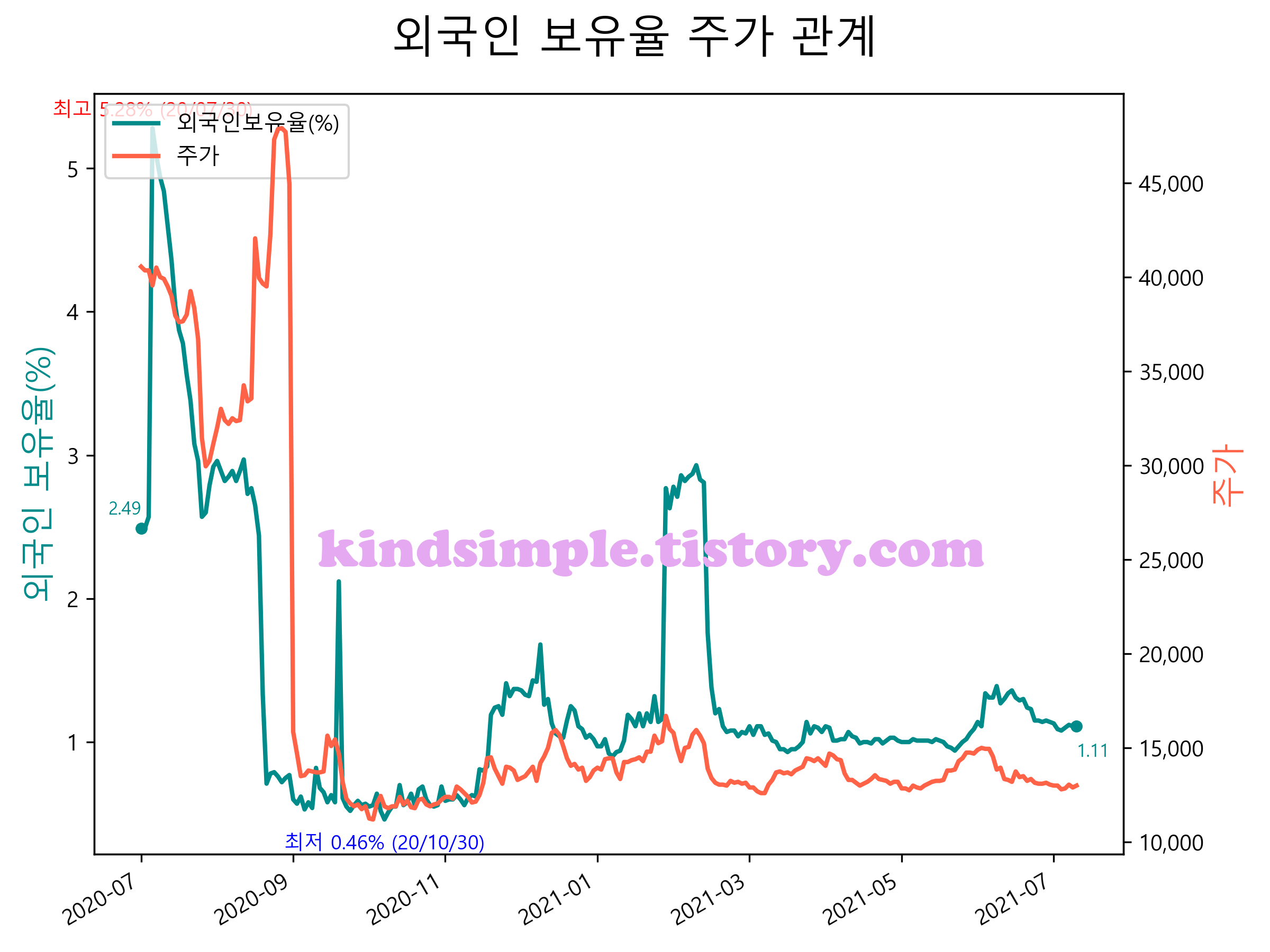 최근 1년간 외국인 보유율 및 주가와의 관계입니다.