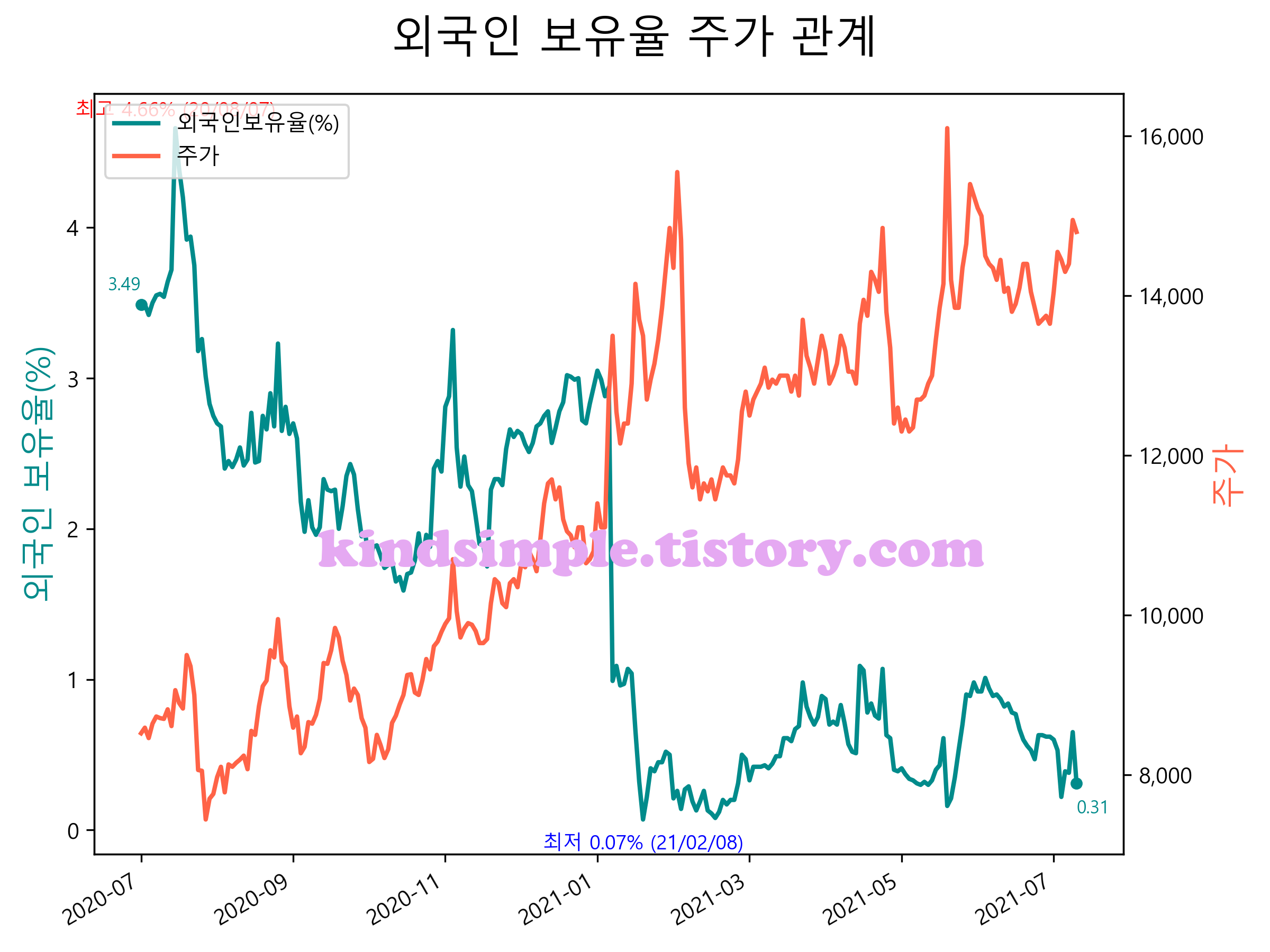 최근 1년간 외국인 보유율 및 주가와의 관계입니다.