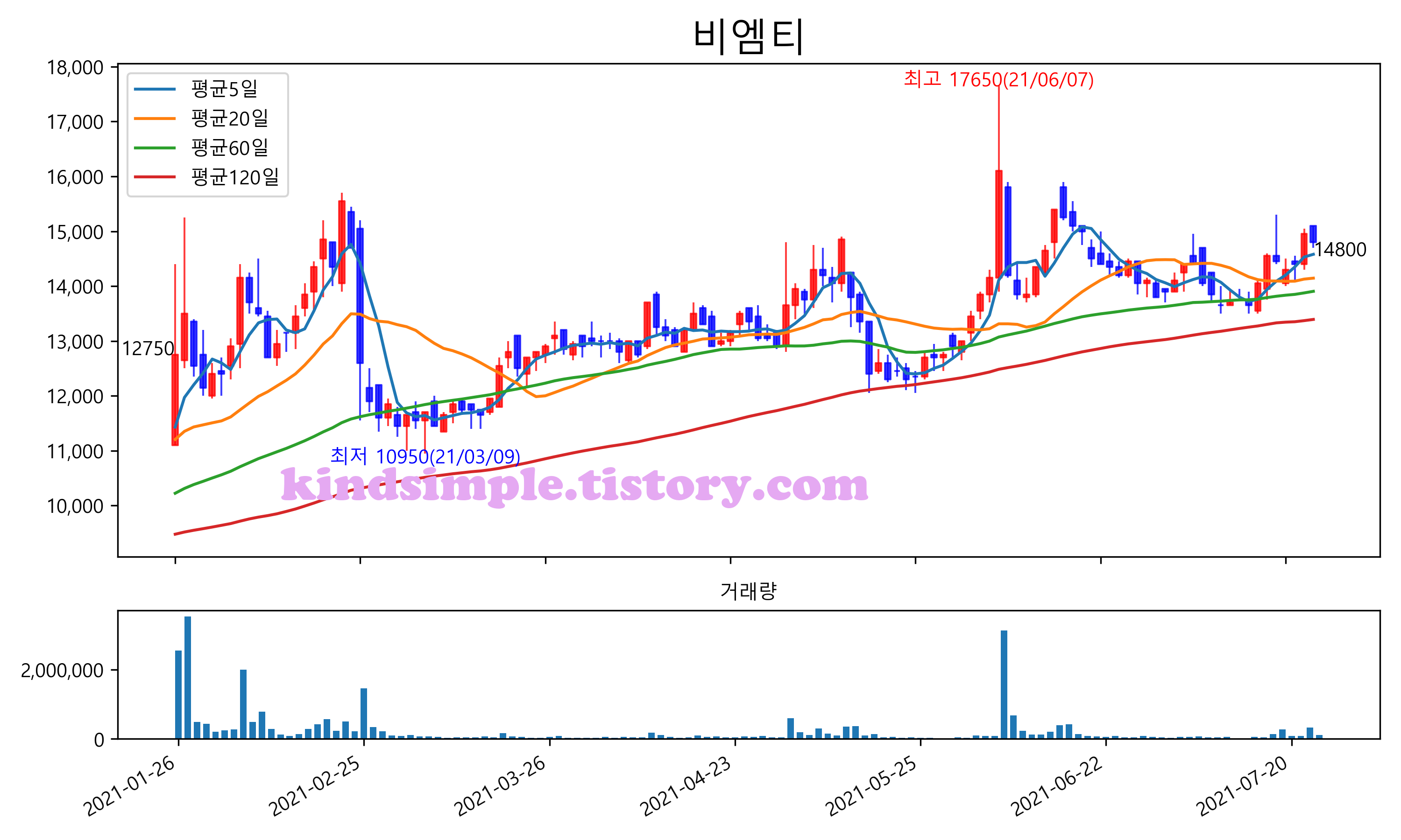 최근 6개월간 캔들차트 및 이동평균선입니다.