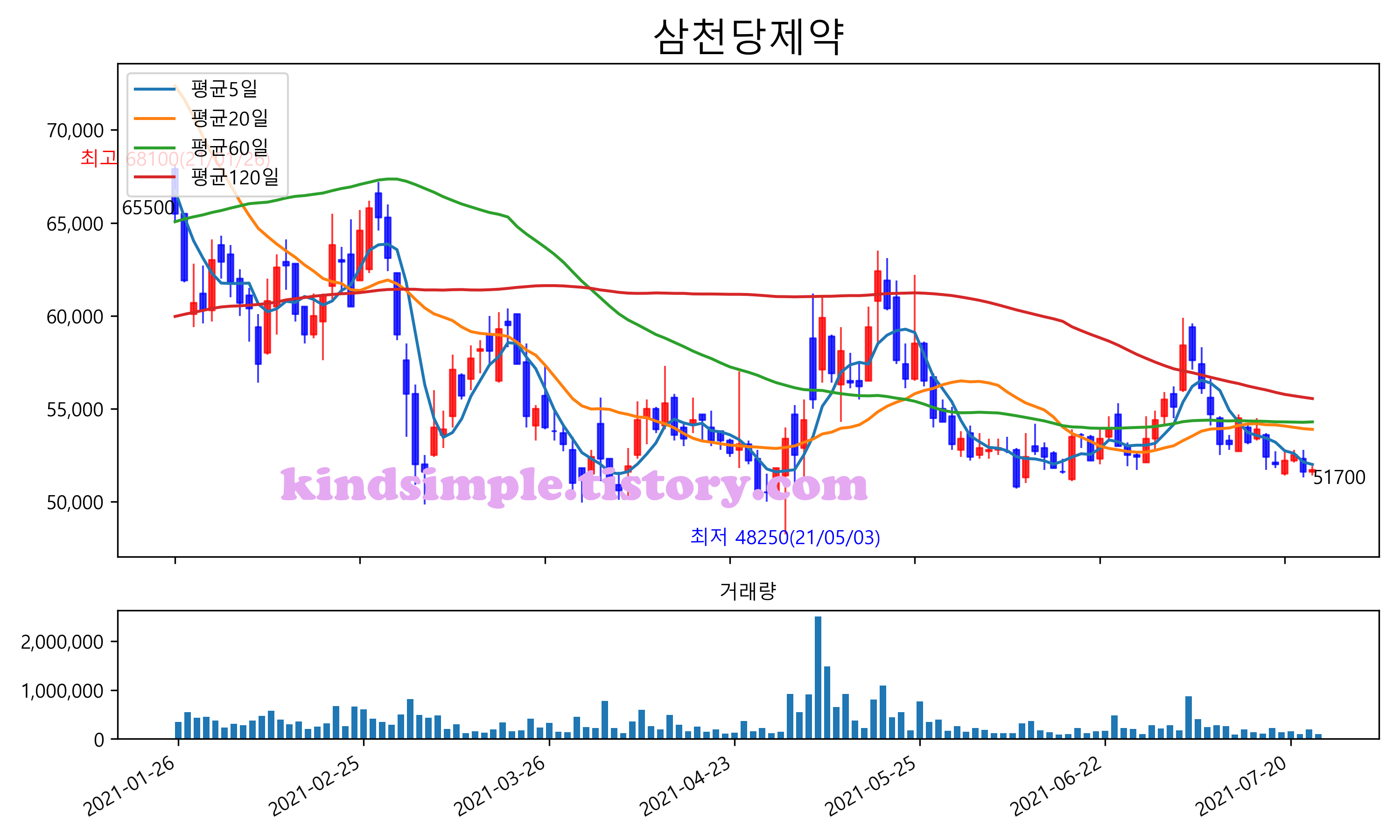 최근 6개월간 캔들차트 및 이동평균선입니다.