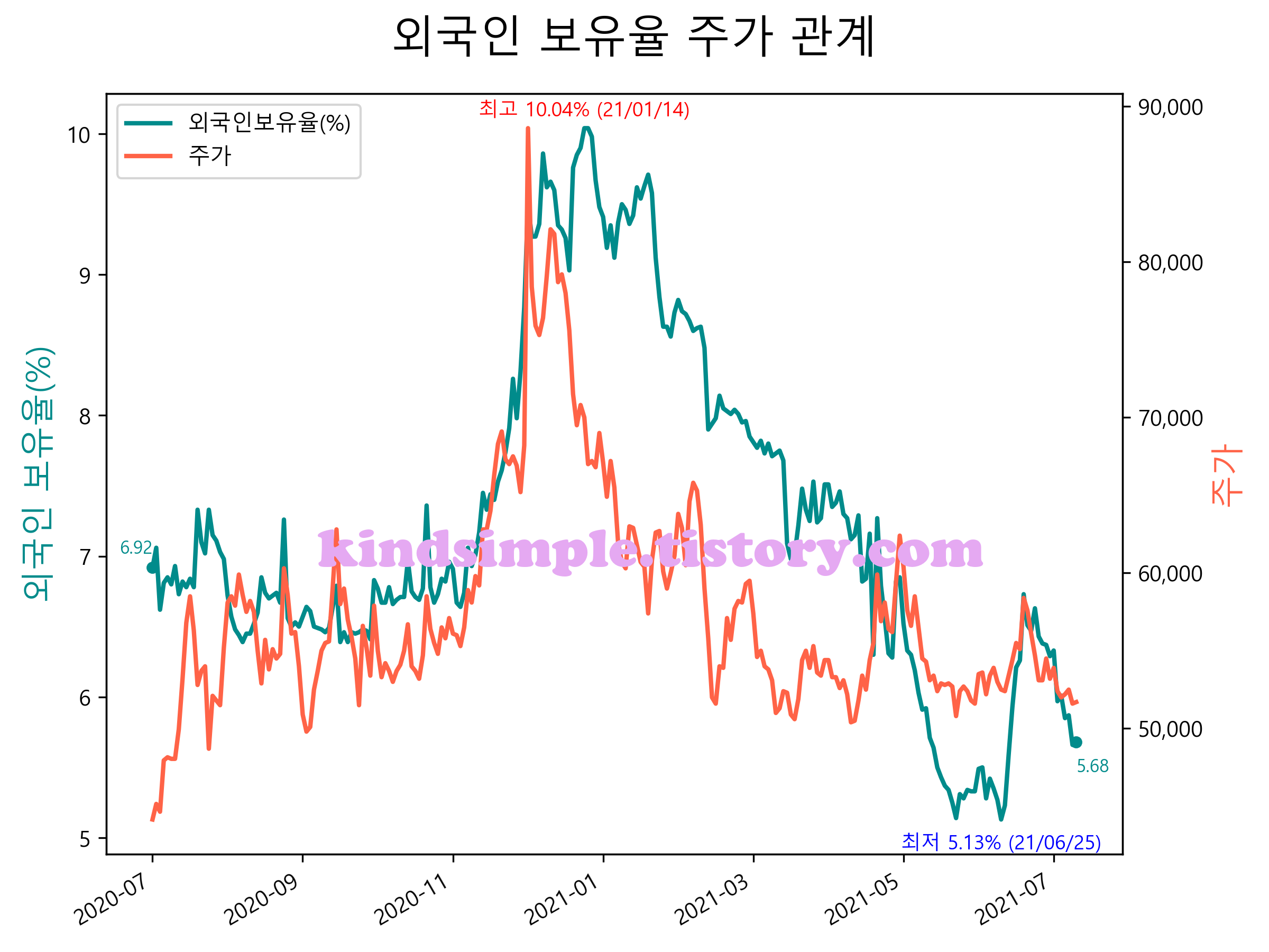 최근 1년간 외국인 보유율 및 주가와의 관계입니다.