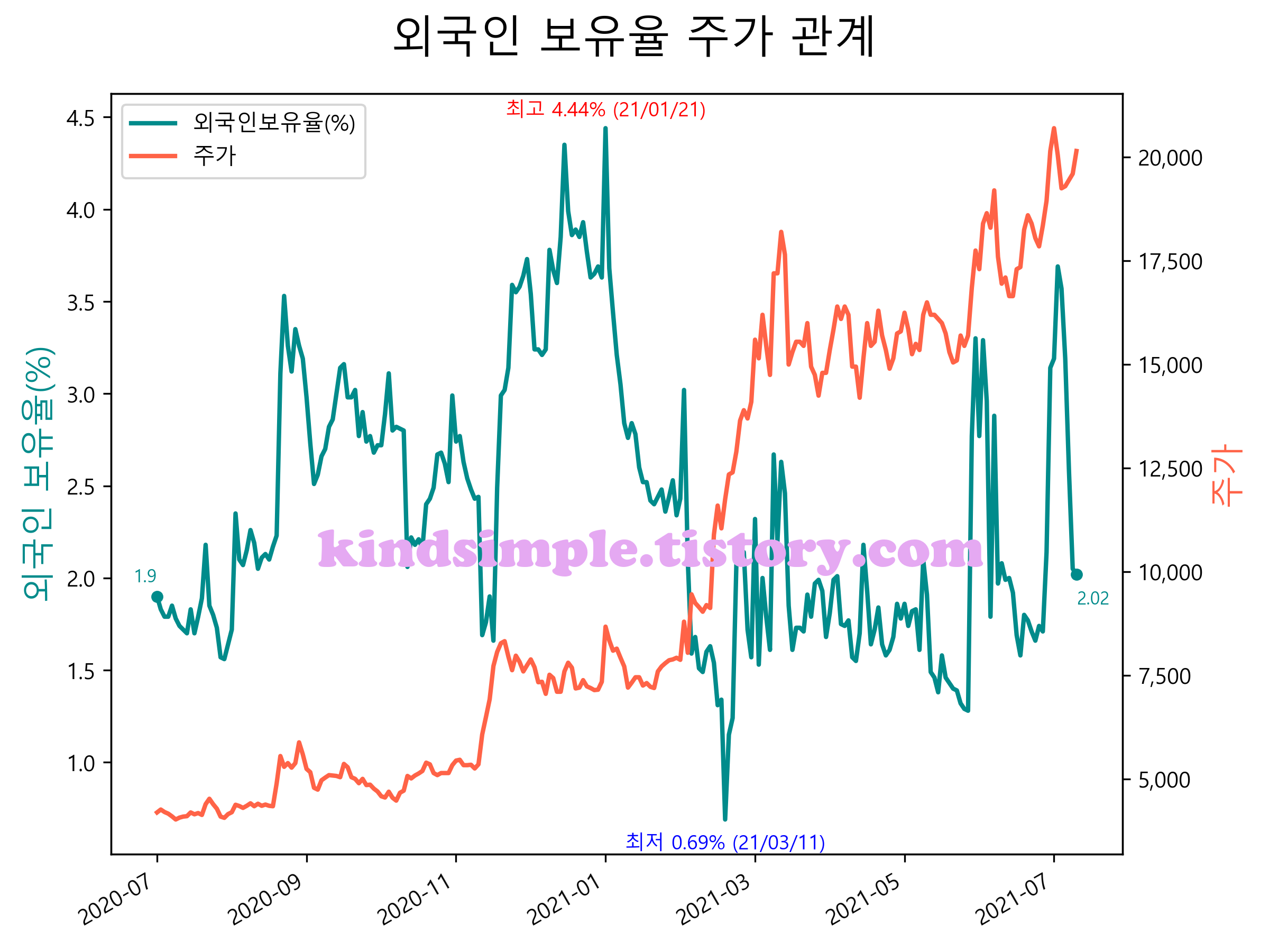 최근 1년간 외국인 보유율 및 주가와의 관계입니다.