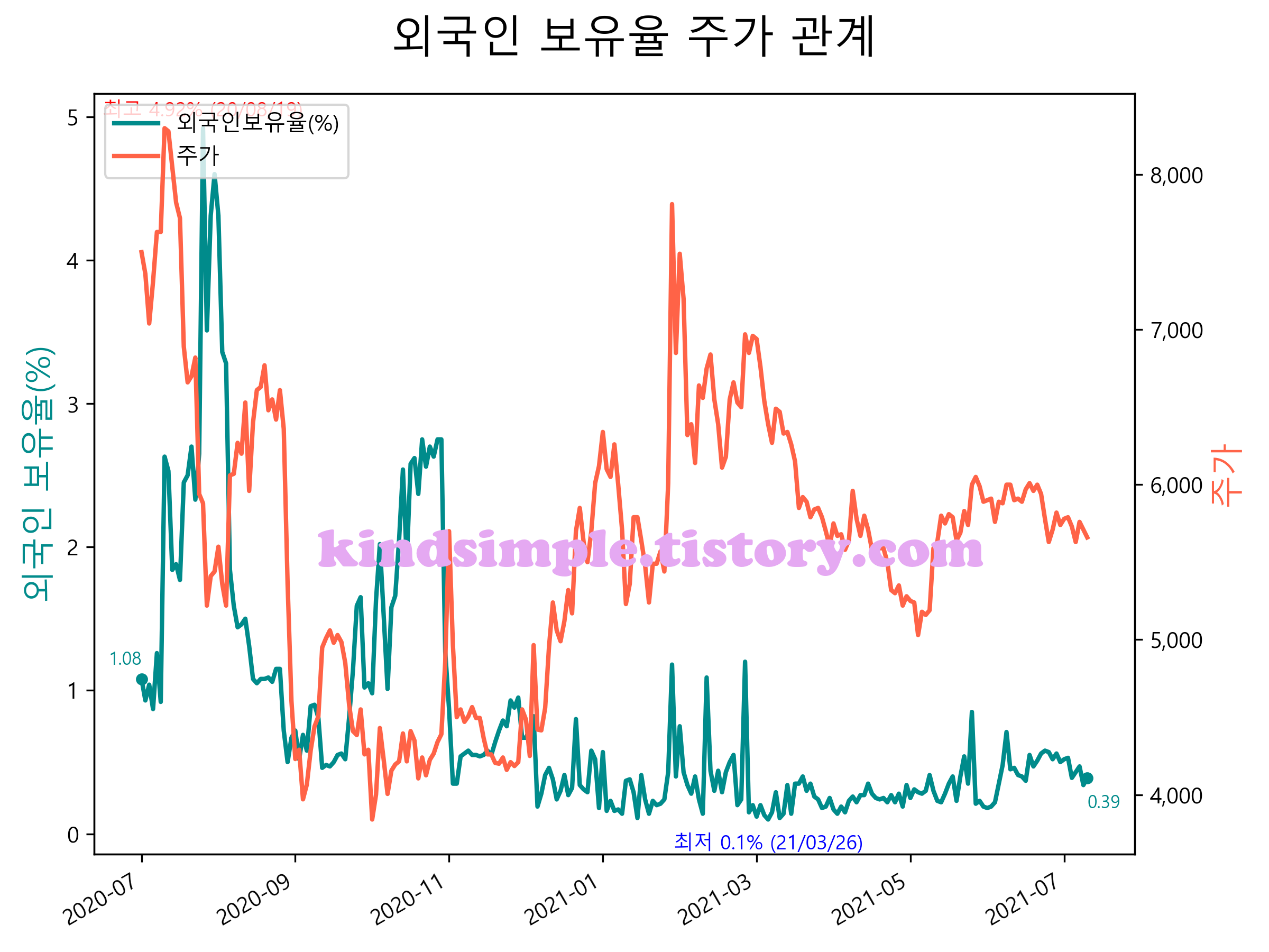최근 1년간 외국인 보유율 및 주가와의 관계입니다.