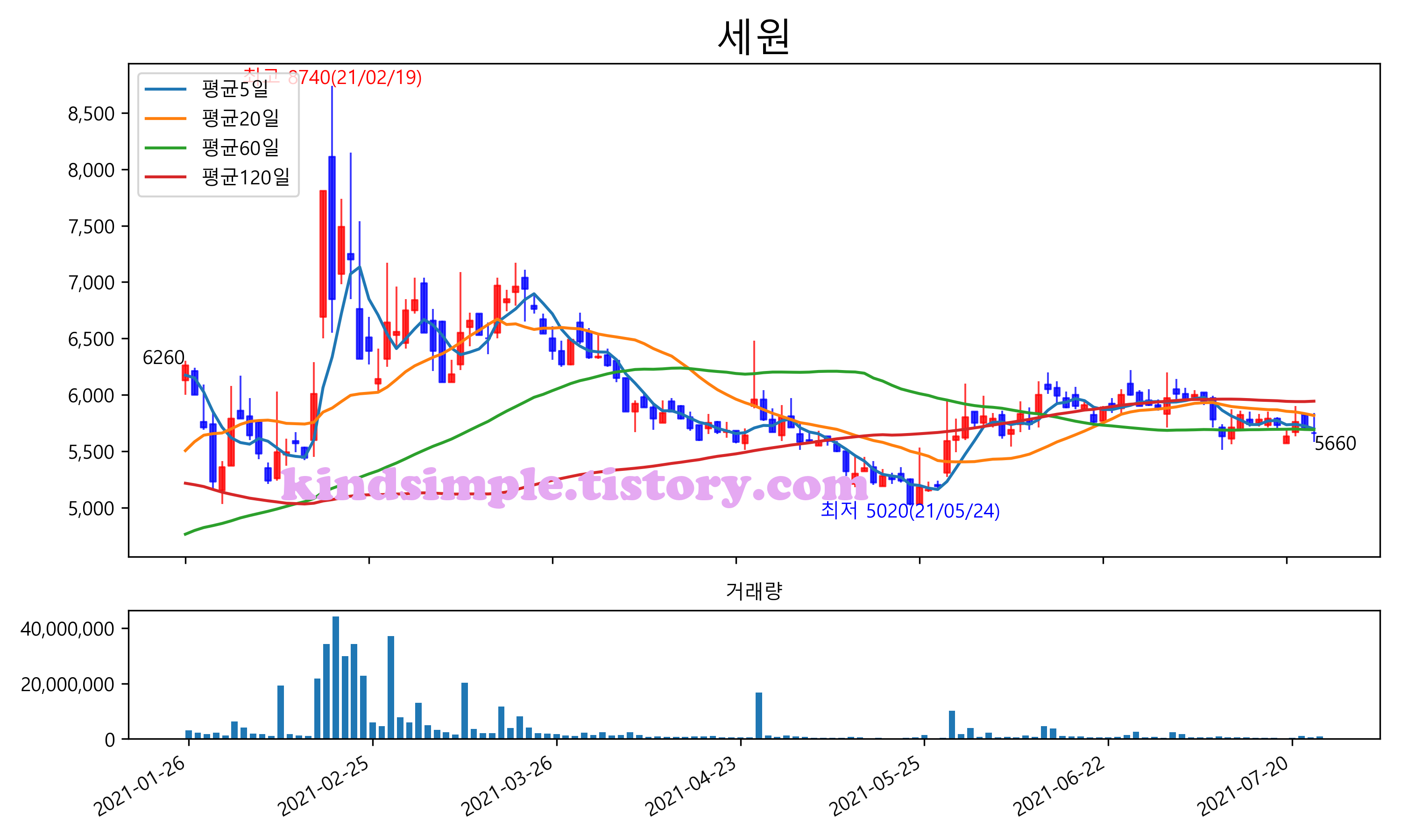 최근 6개월간 캔들차트 및 이동평균선입니다.