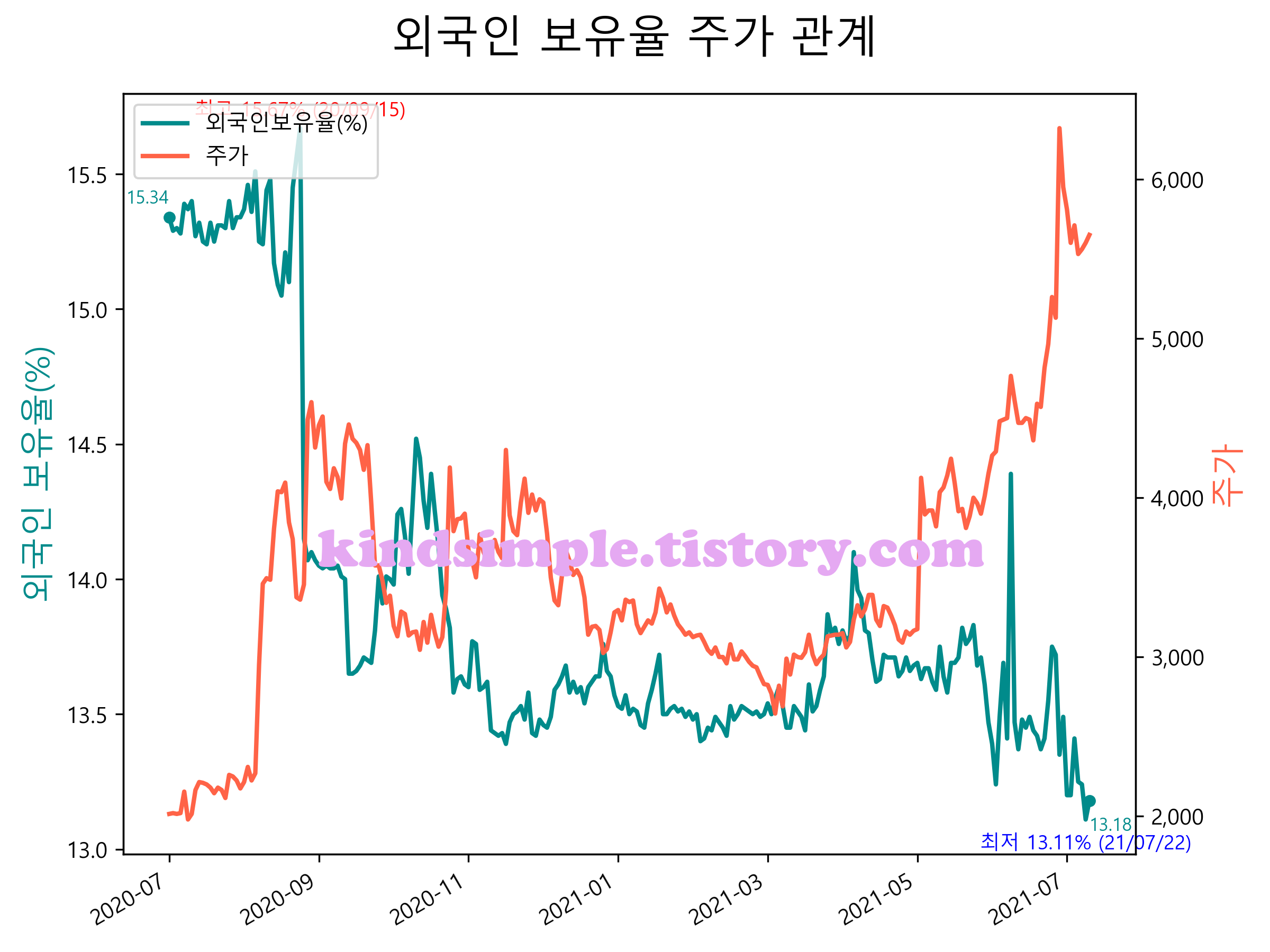 최근 1년간 외국인 보유율 및 주가와의 관계입니다.
