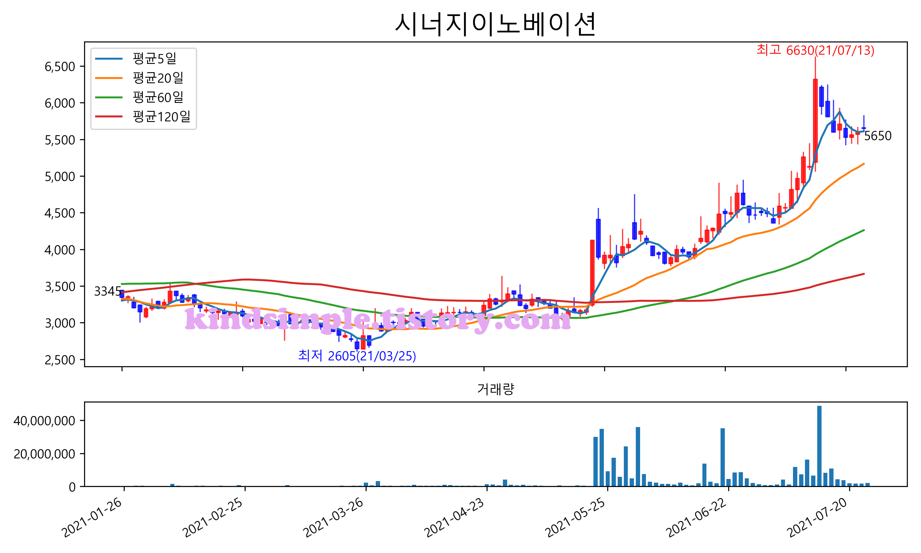 최근 6개월간 캔들차트 및 이동평균선입니다.