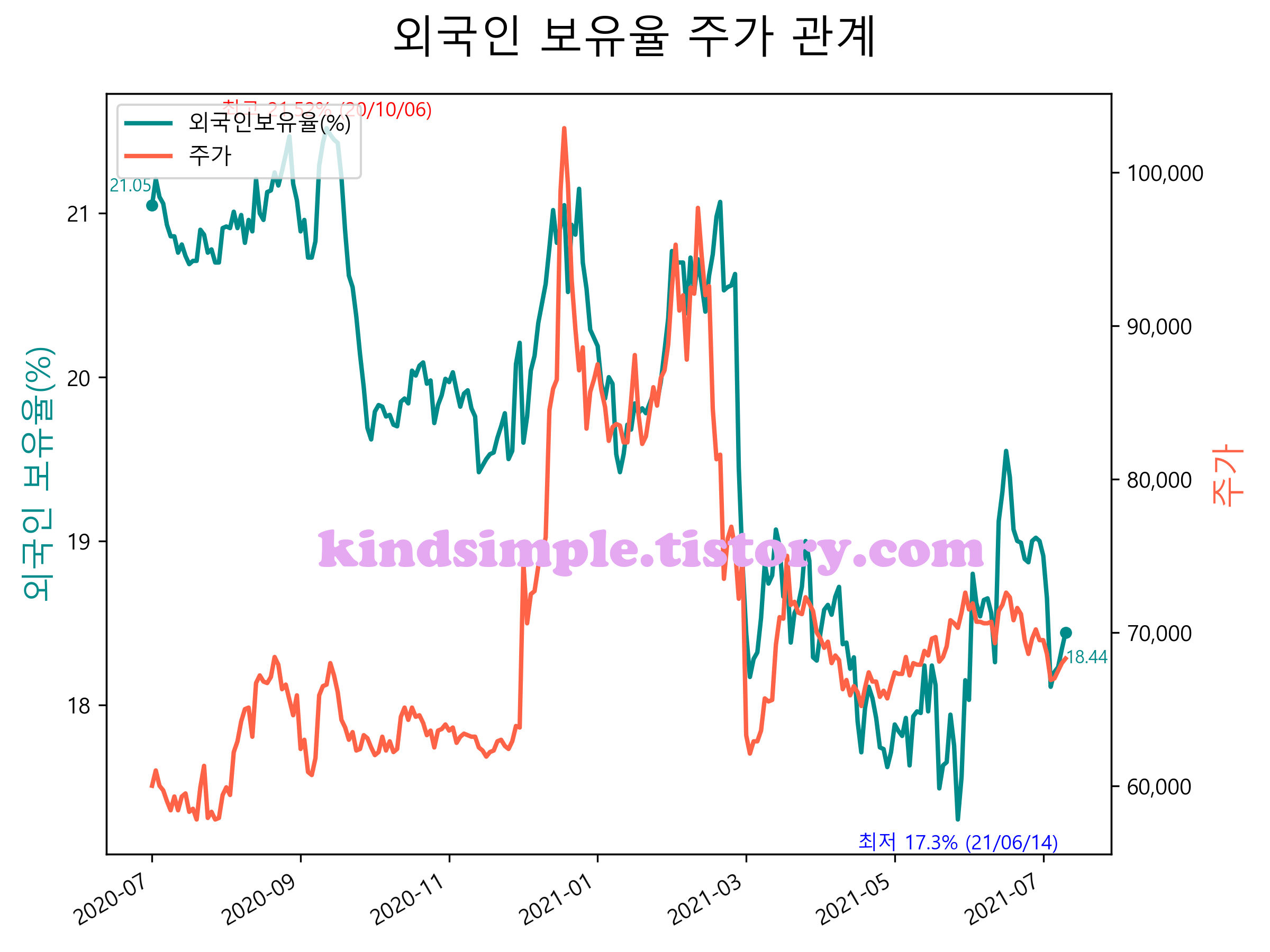 최근 1년간 외국인 보유율 및 주가와의 관계입니다.