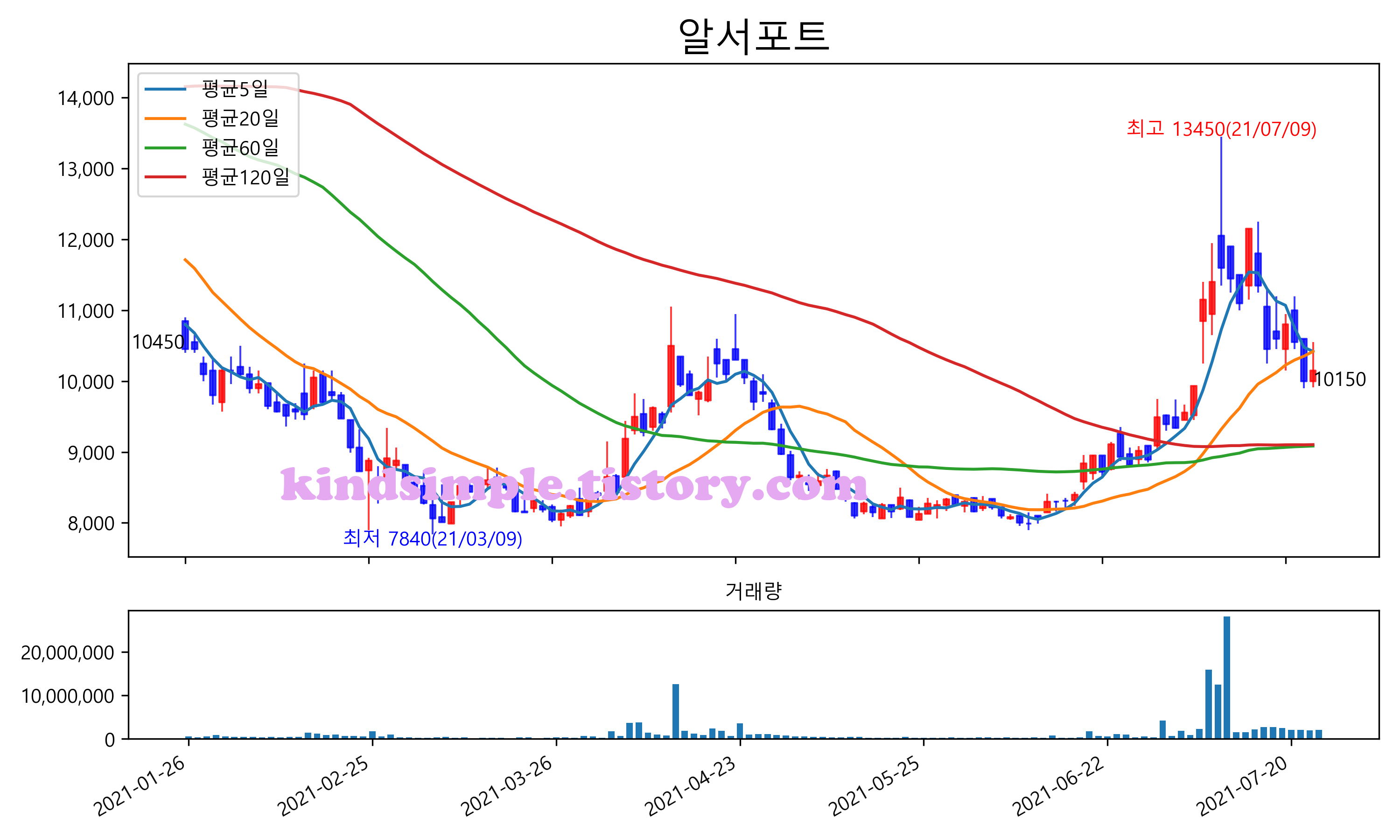 최근 6개월간 캔들차트 및 이동평균선입니다.