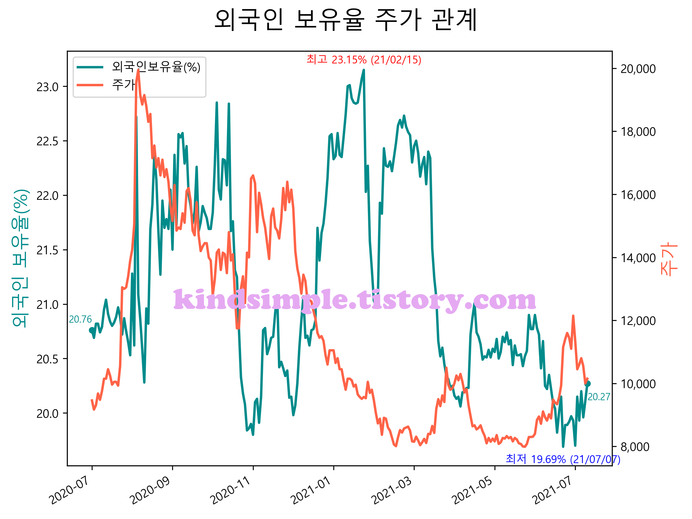 최근 1년간 외국인 보유율 및 주가와의 관계입니다.