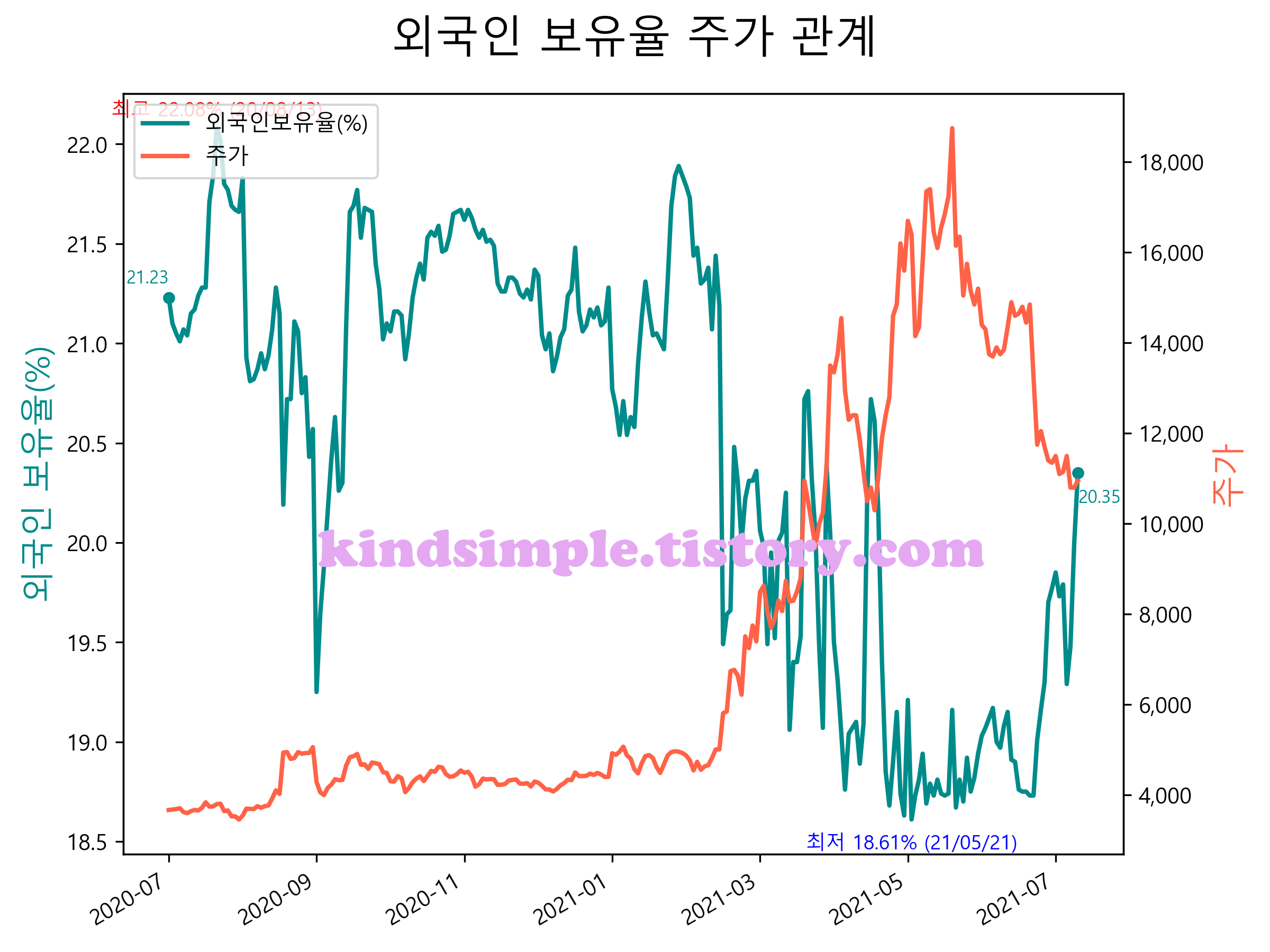 최근 1년간 외국인 보유율 및 주가와의 관계입니다.