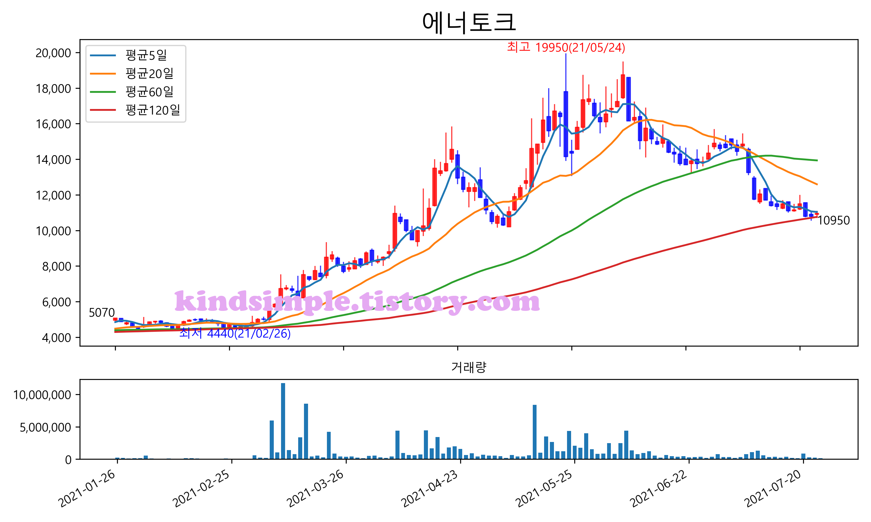 최근 6개월간 캔들차트 및 이동평균선입니다.