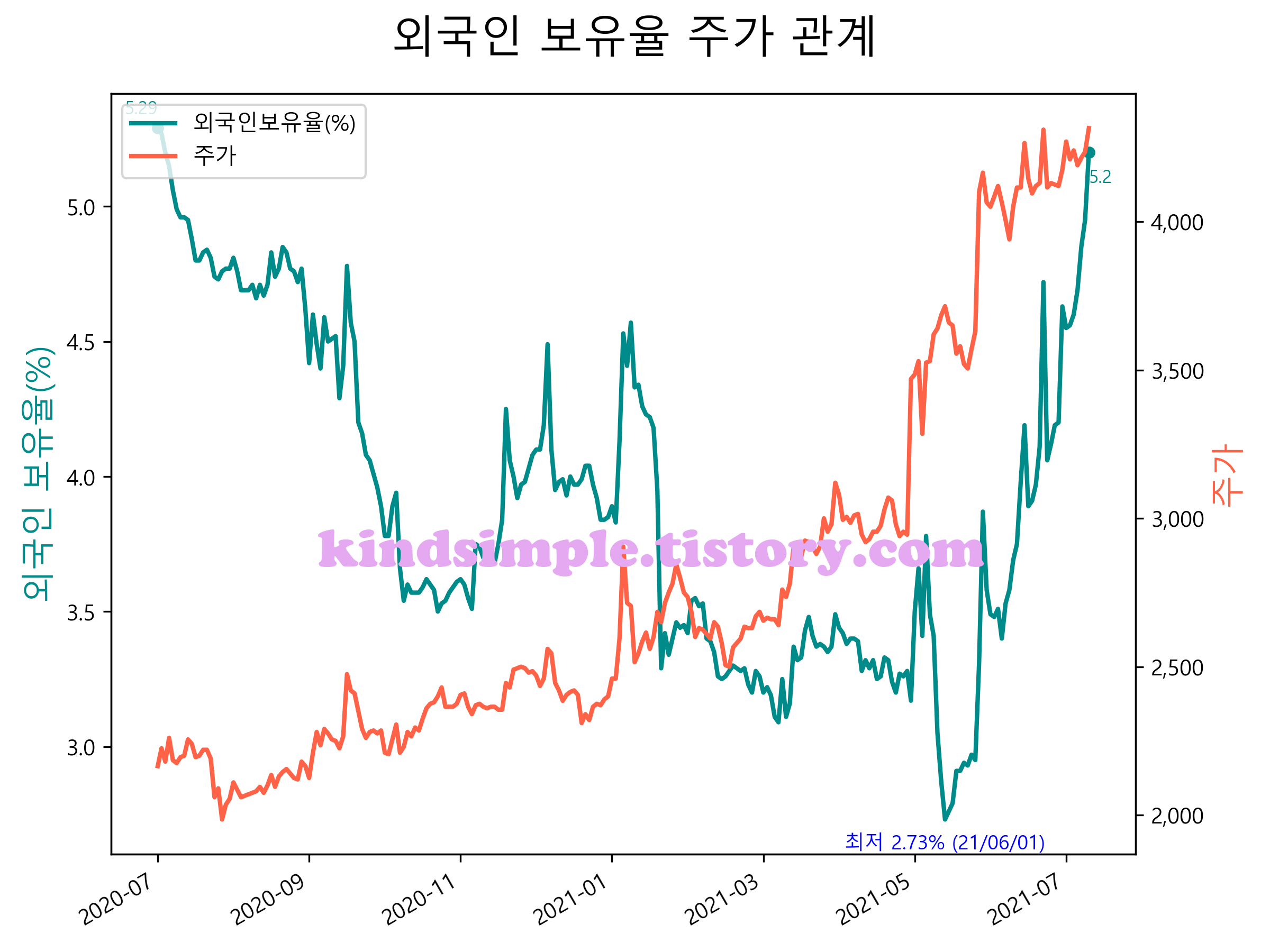 최근 1년간 외국인 보유율 및 주가와의 관계입니다.