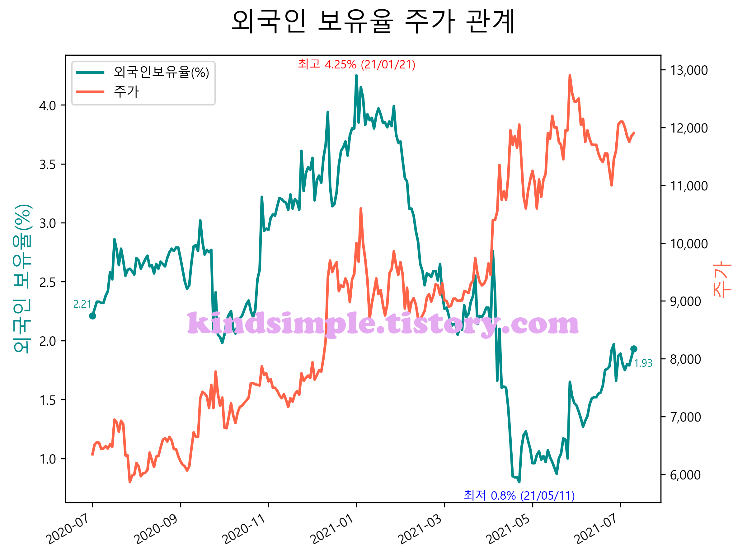 최근 1년간 외국인 보유율 및 주가와의 관계입니다.