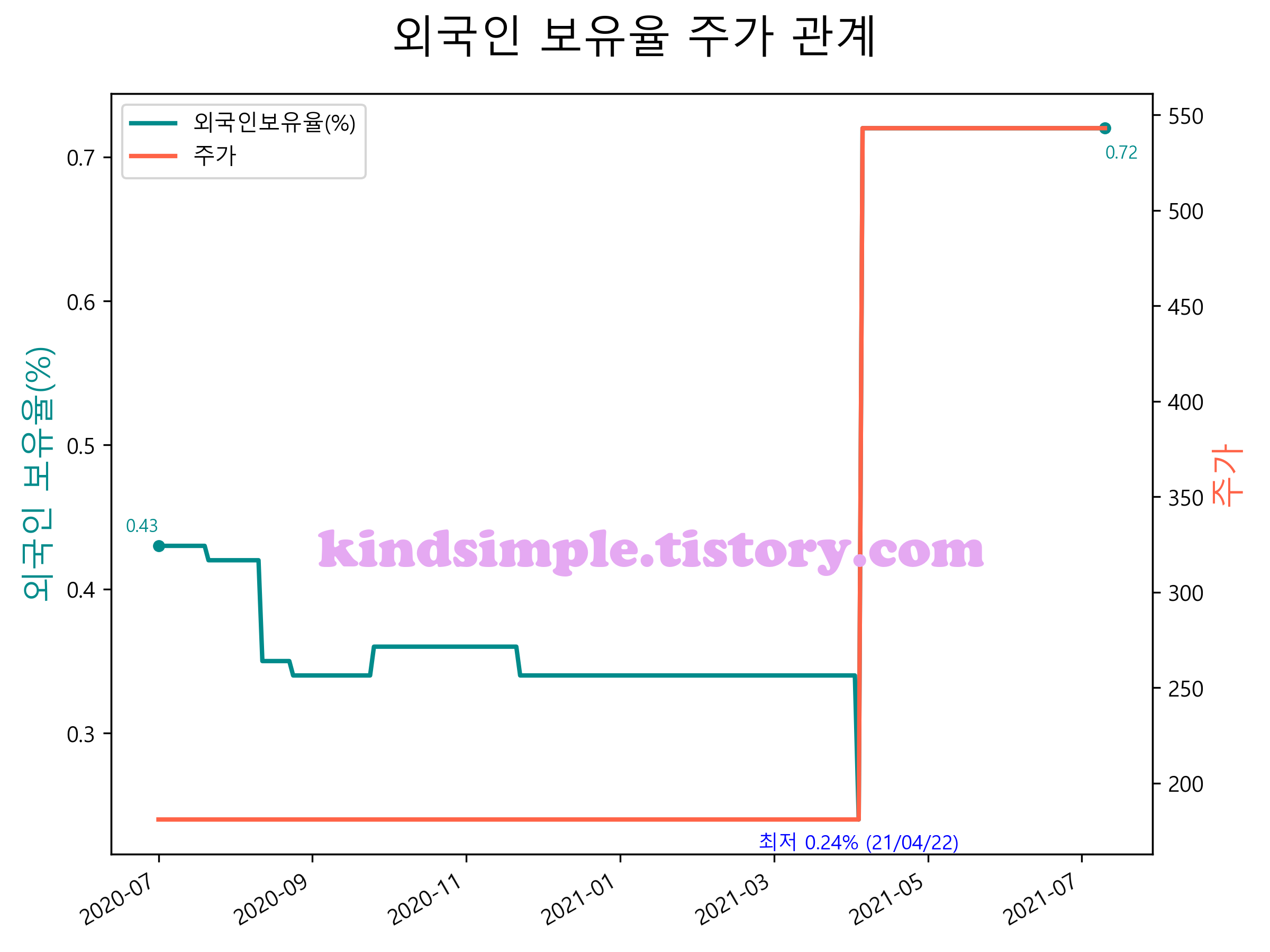 최근 1년간 외국인 보유율 및 주가와의 관계입니다.