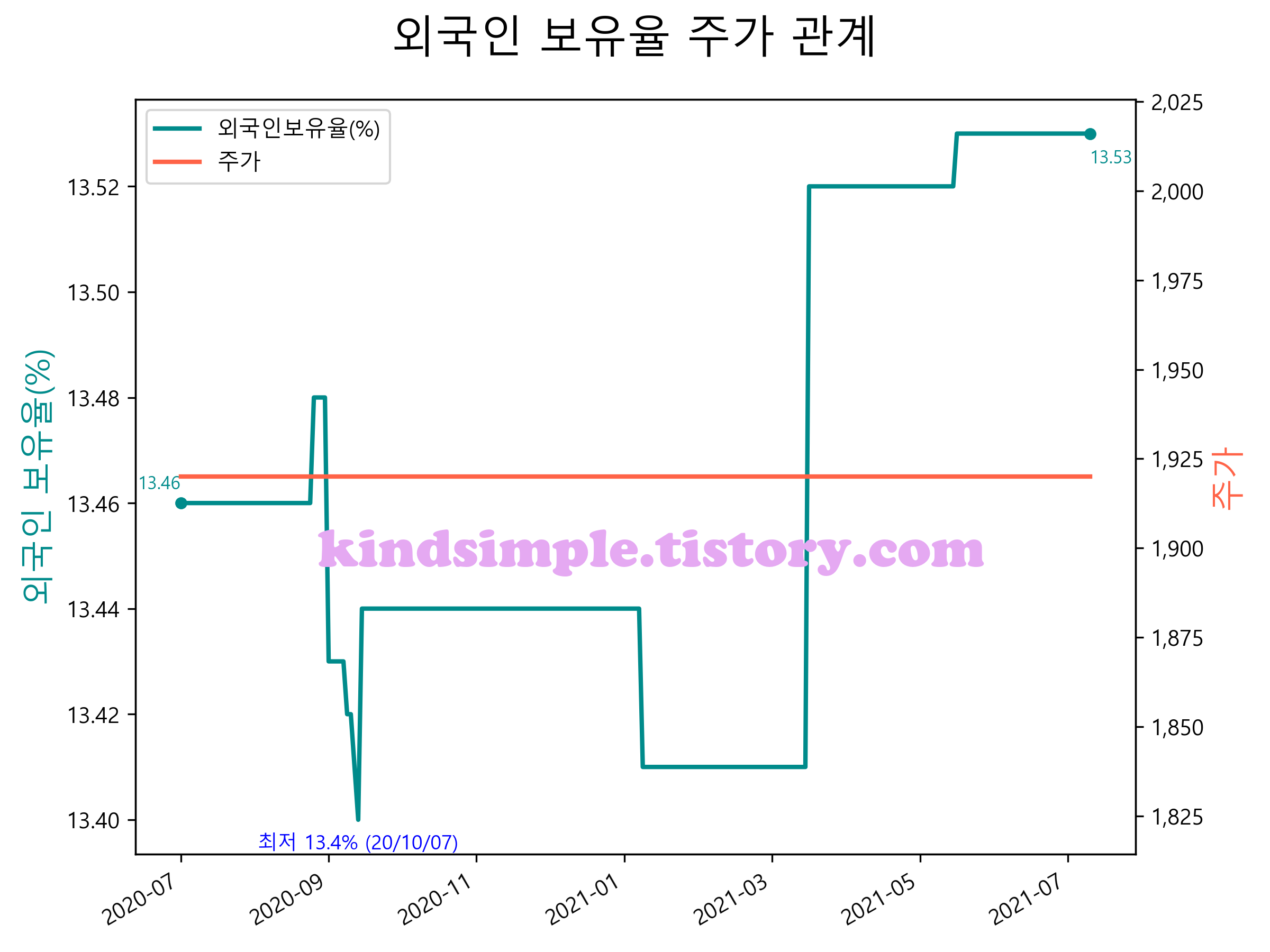 최근 1년간 외국인 보유율 및 주가와의 관계입니다.