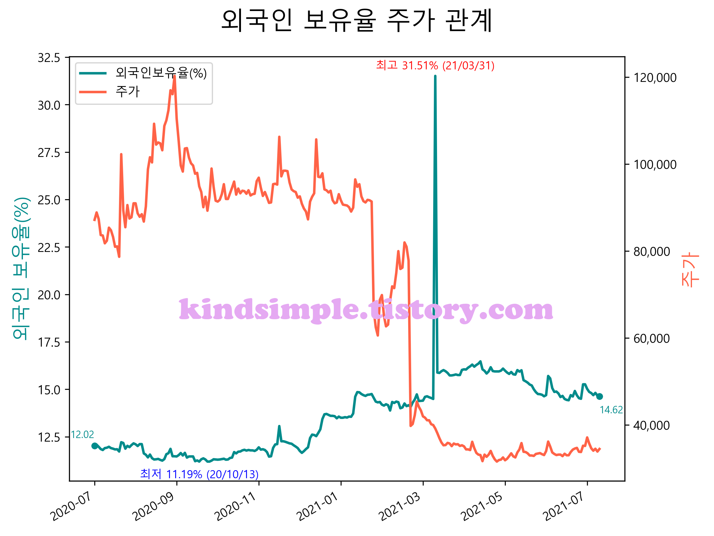 최근 1년간 외국인 보유율 및 주가와의 관계입니다.