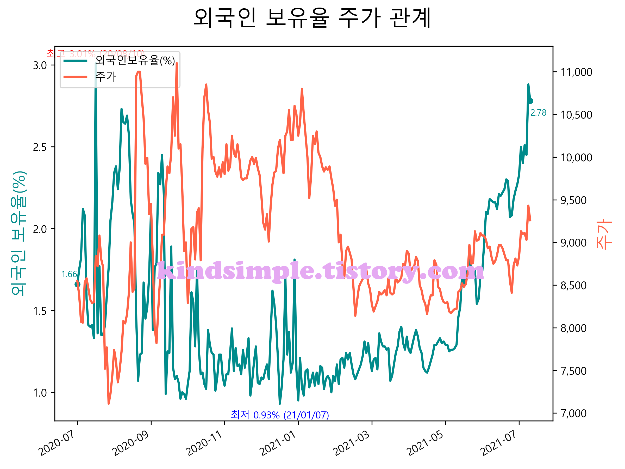 최근 1년간 외국인 보유율 및 주가와의 관계입니다.