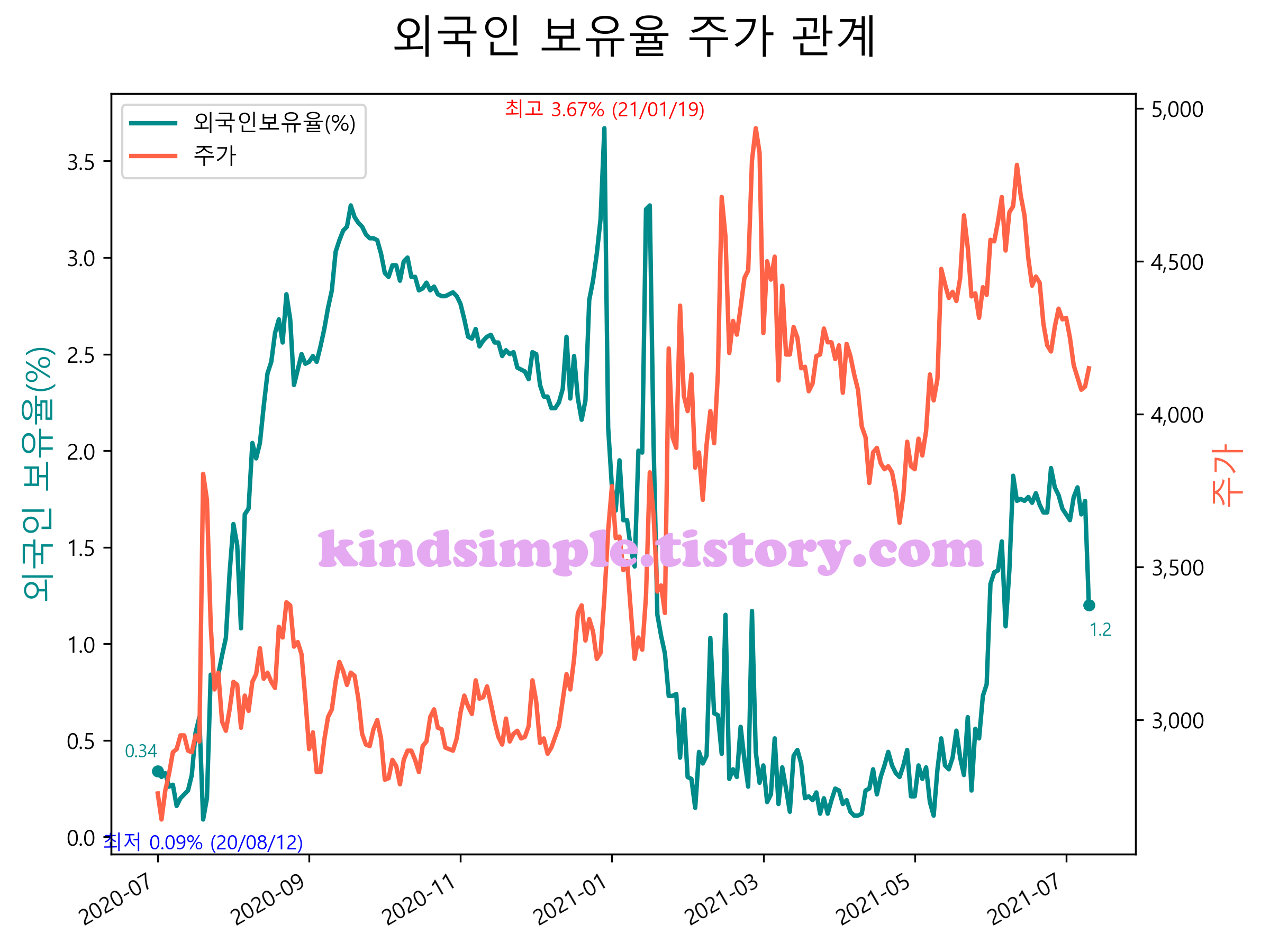 최근 1년간 외국인 보유율 및 주가와의 관계입니다.