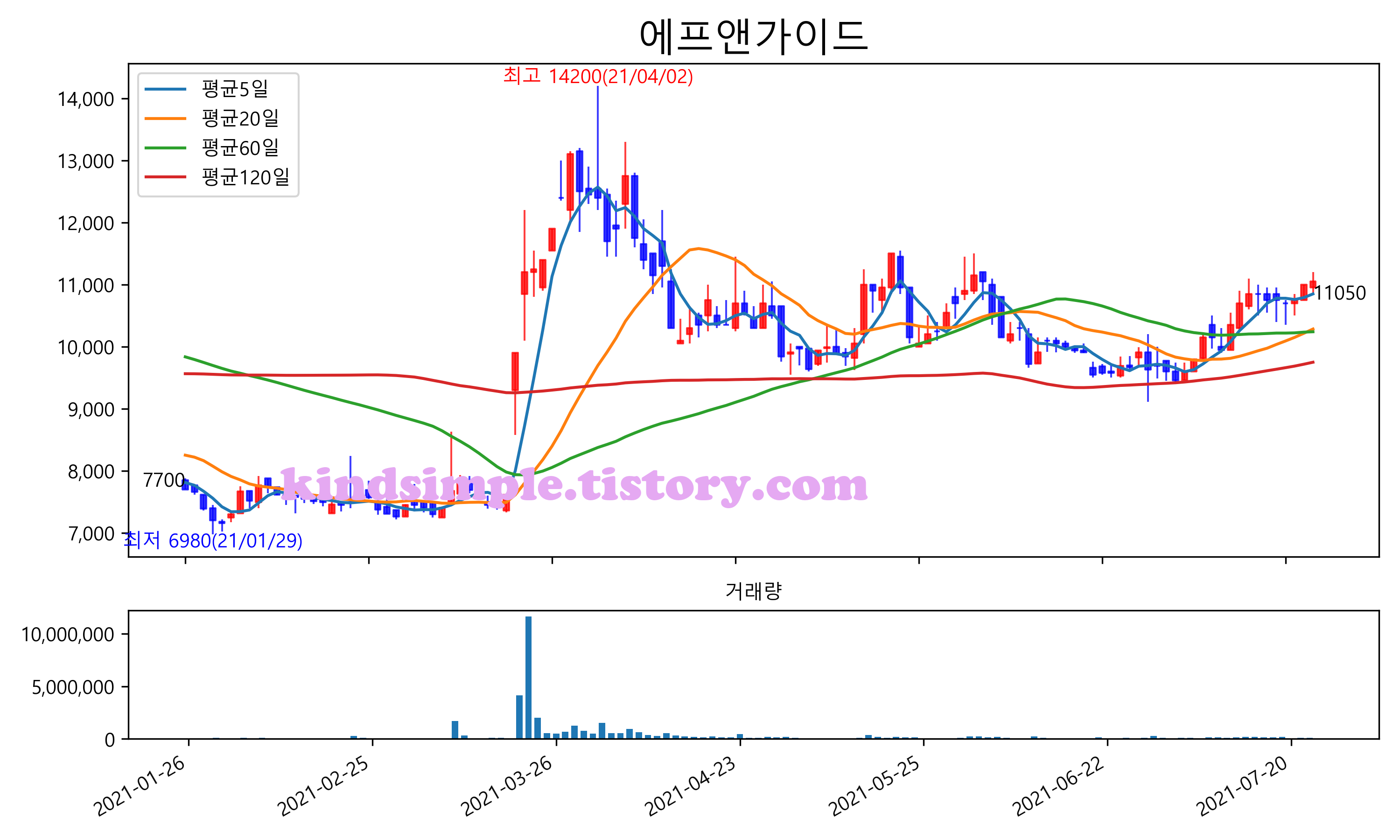 최근 6개월간 캔들차트 및 이동평균선입니다.