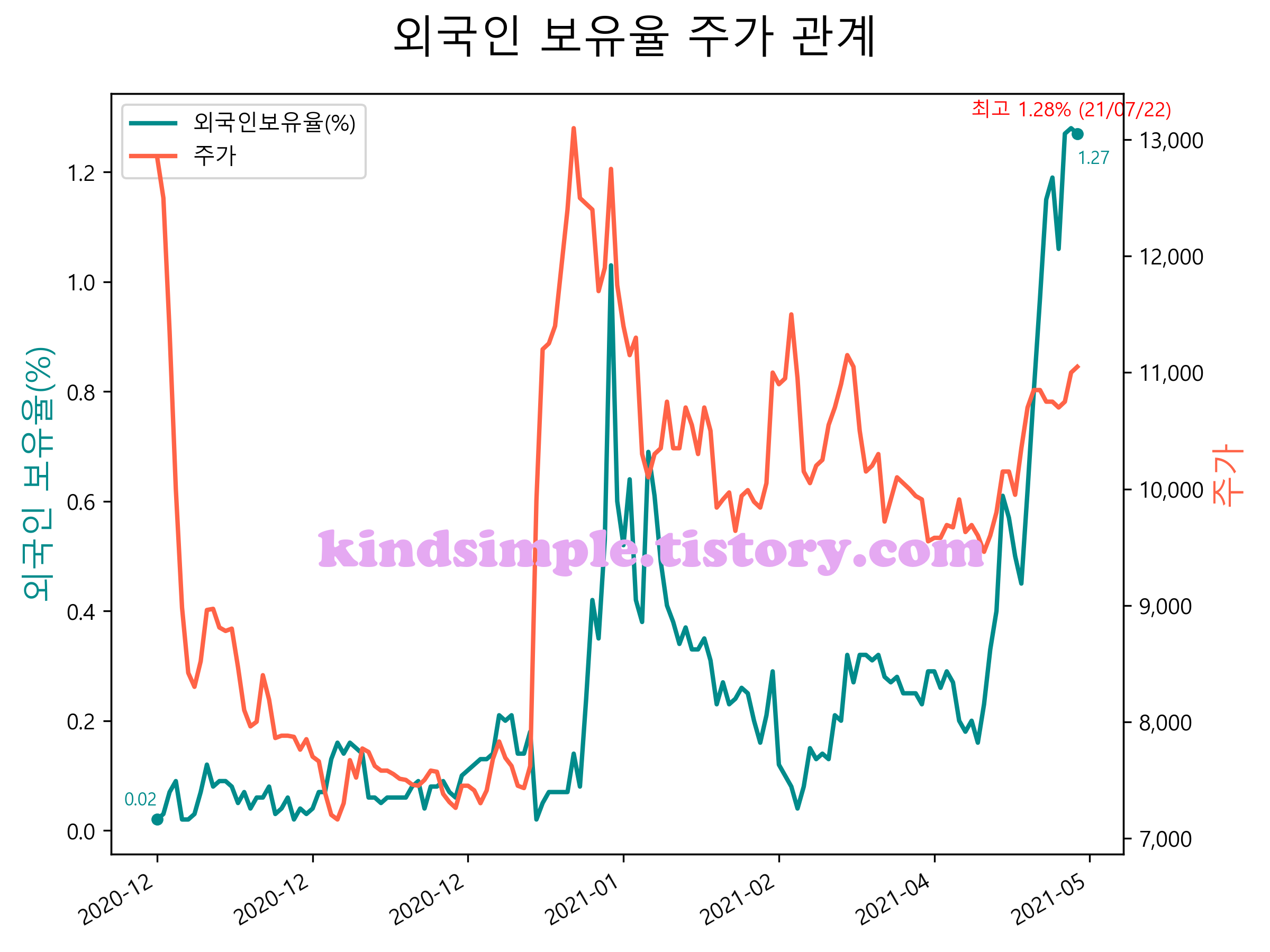 최근 1년간 외국인 보유율 및 주가와의 관계입니다.
