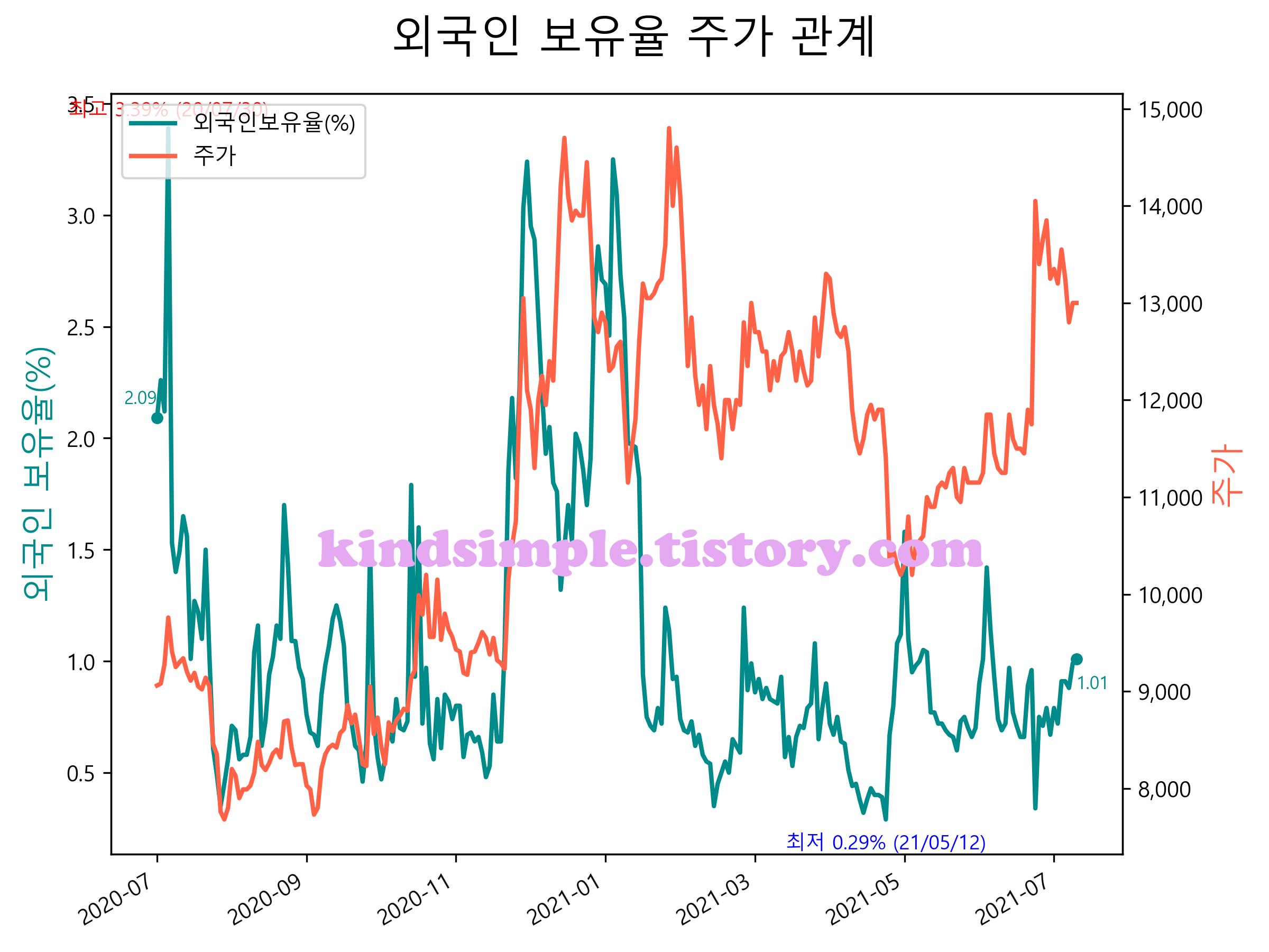 최근 1년간 외국인 보유율 및 주가와의 관계입니다.