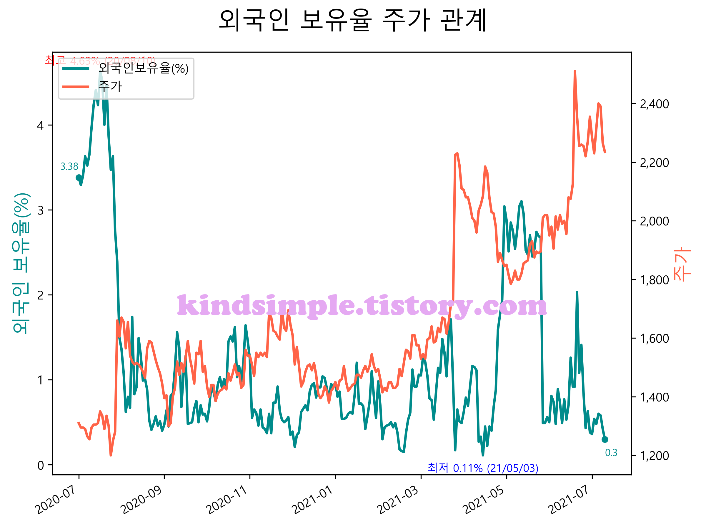 최근 1년간 외국인 보유율 및 주가와의 관계입니다.