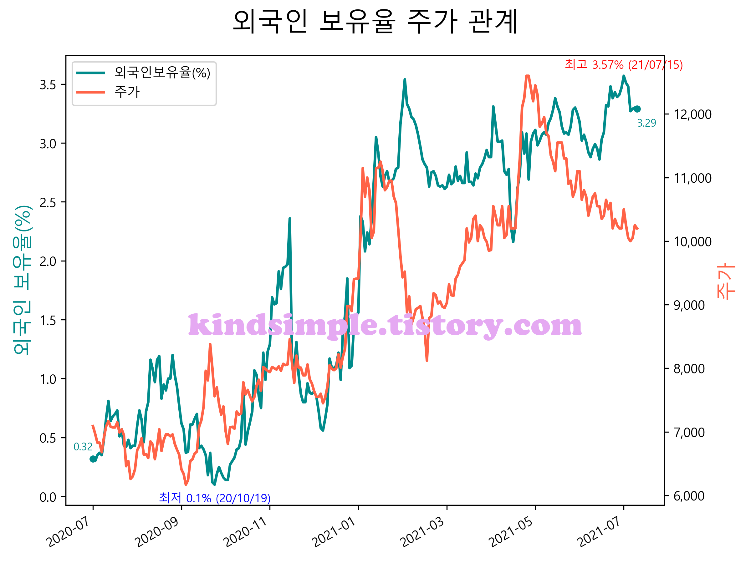 최근 1년간 외국인 보유율 및 주가와의 관계입니다.