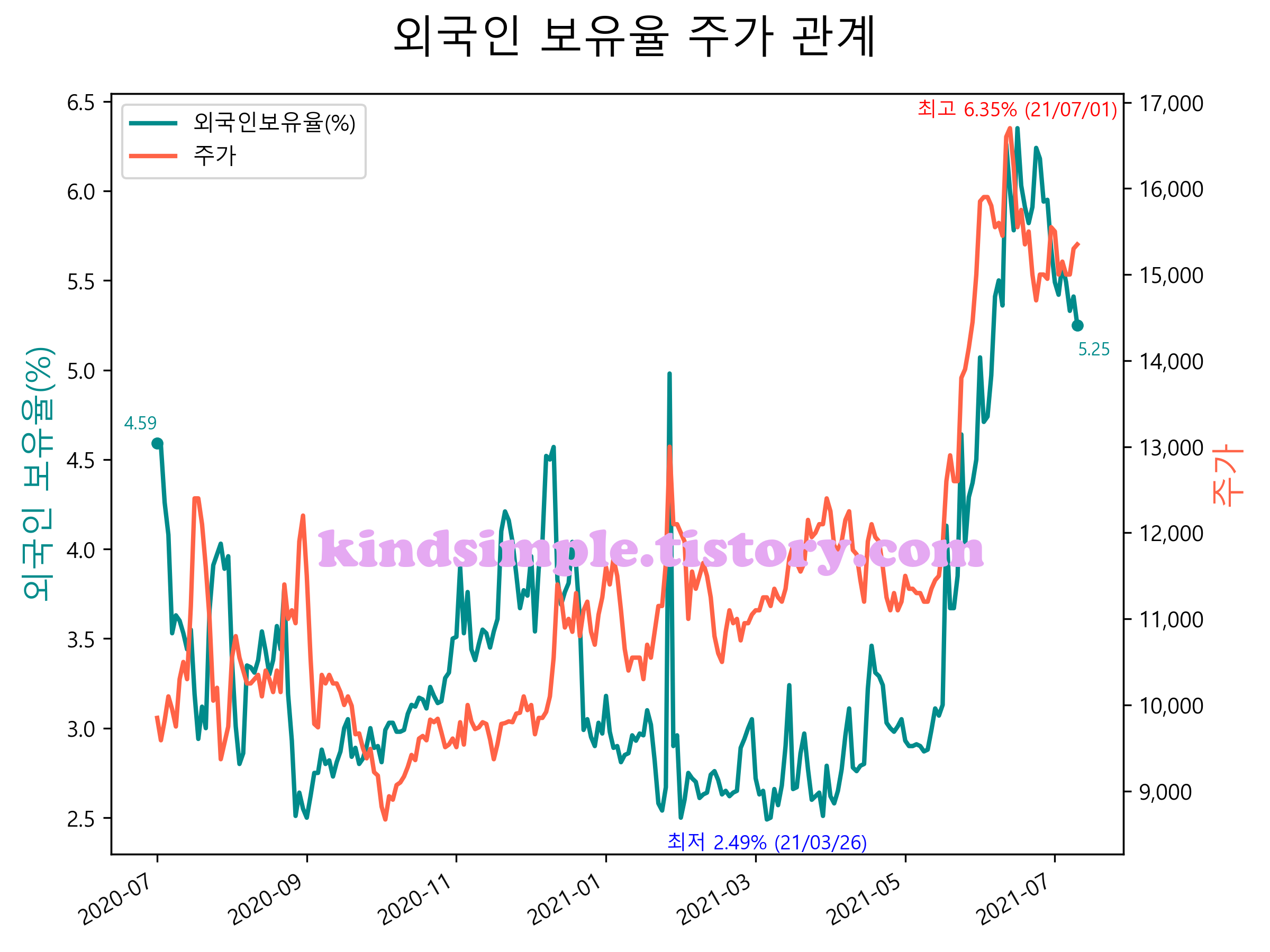최근 1년간 외국인 보유율 및 주가와의 관계입니다.