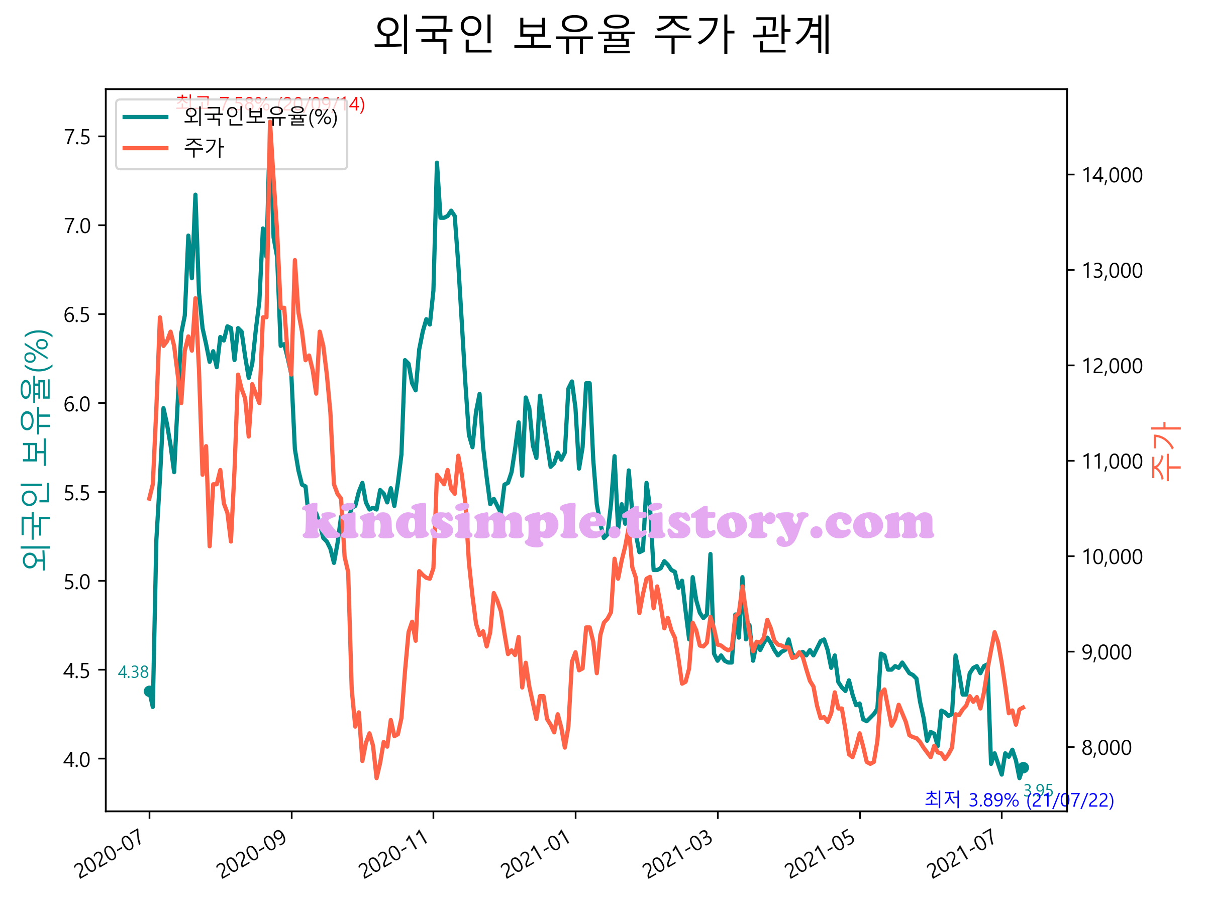 최근 1년간 외국인 보유율 및 주가와의 관계입니다.