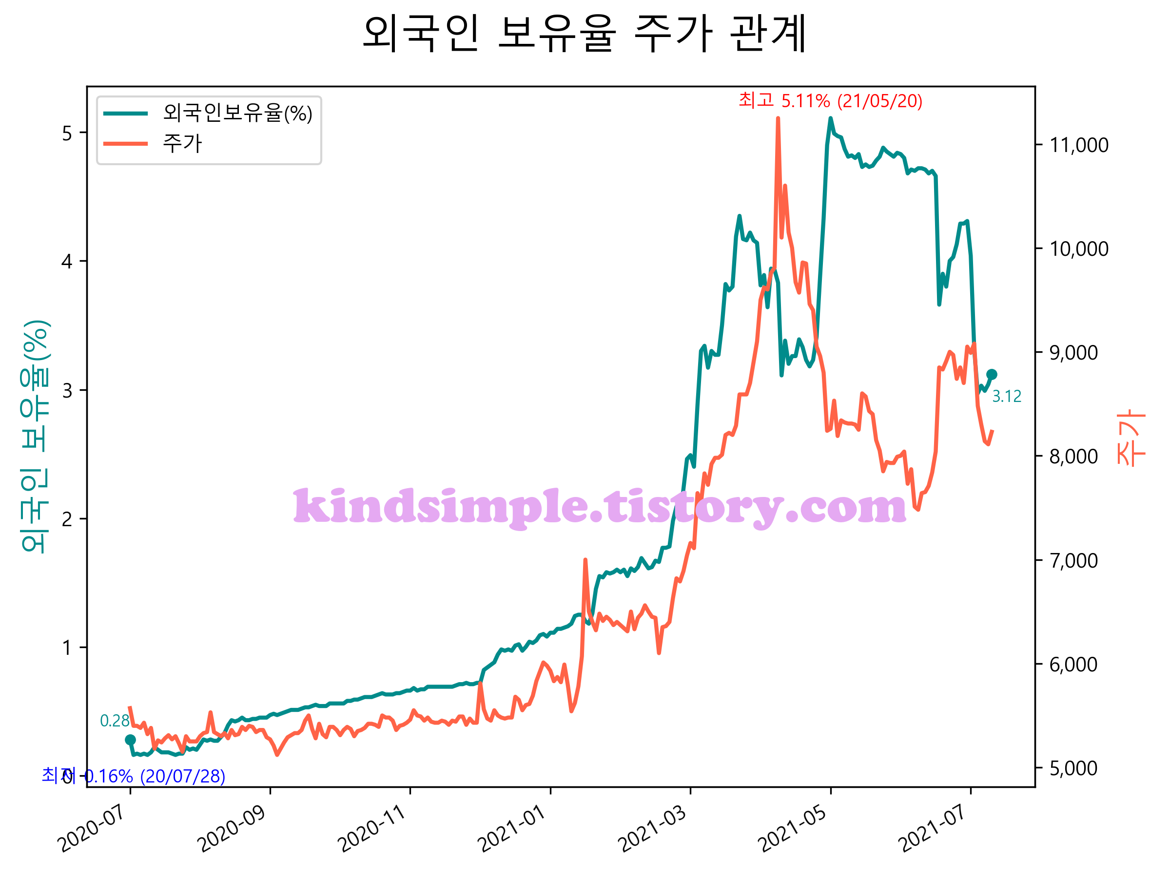 최근 1년간 외국인 보유율 및 주가와의 관계입니다.