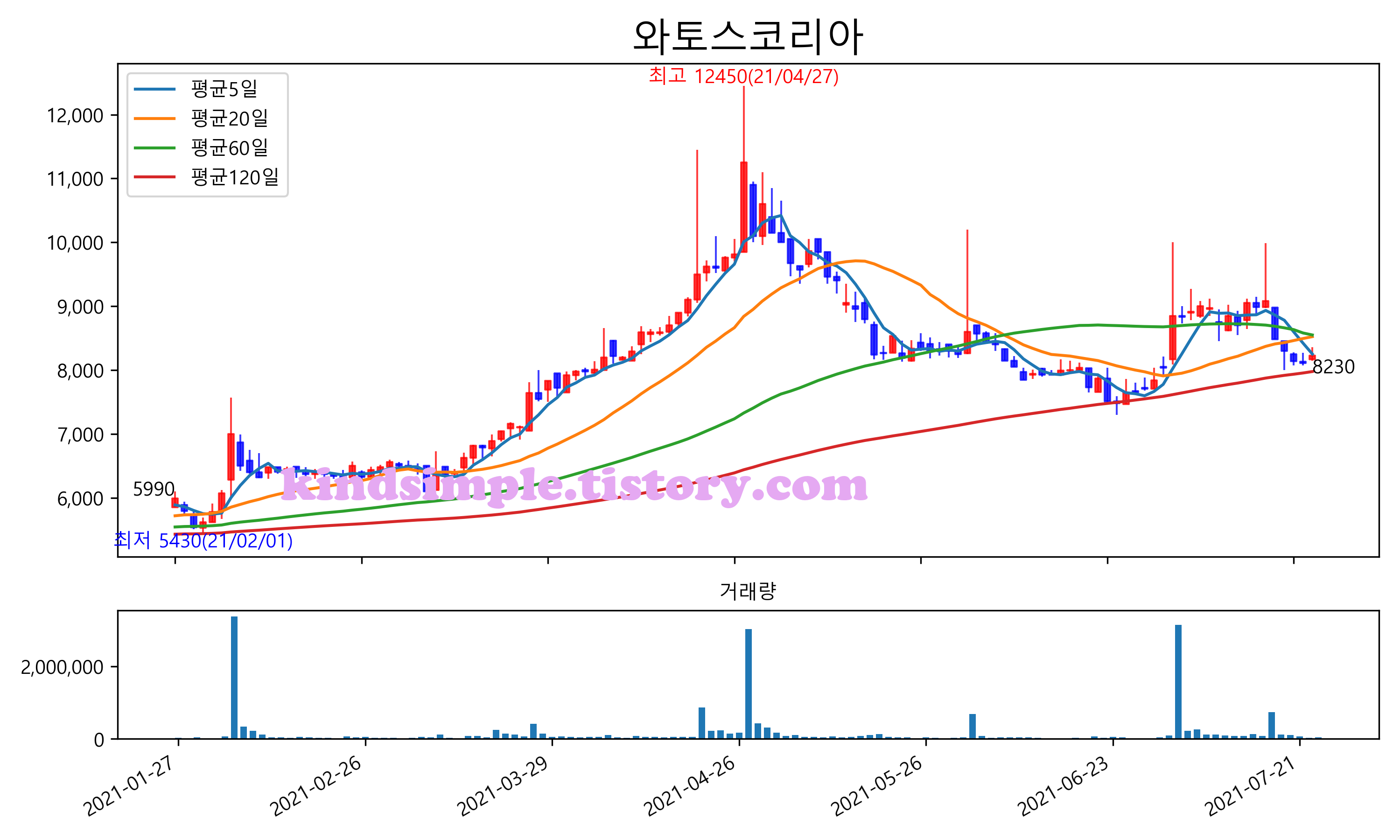 최근 6개월간 캔들차트 및 이동평균선입니다.