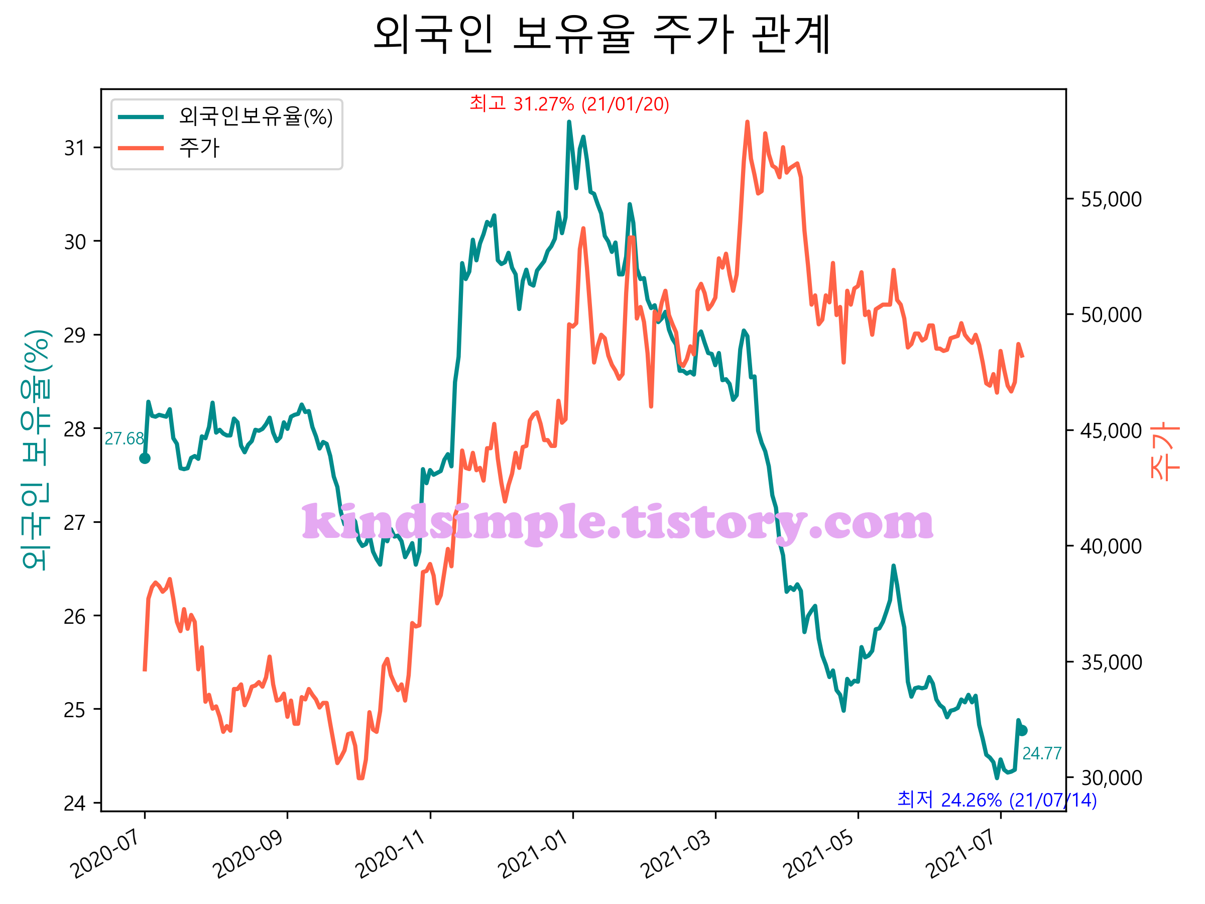 최근 1년간 외국인 보유율 및 주가와의 관계입니다.
