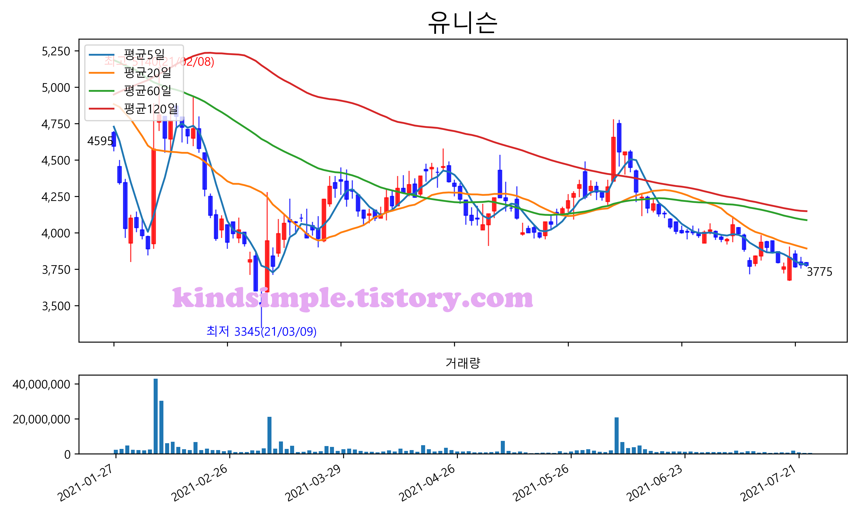 최근 6개월간 캔들차트 및 이동평균선입니다.