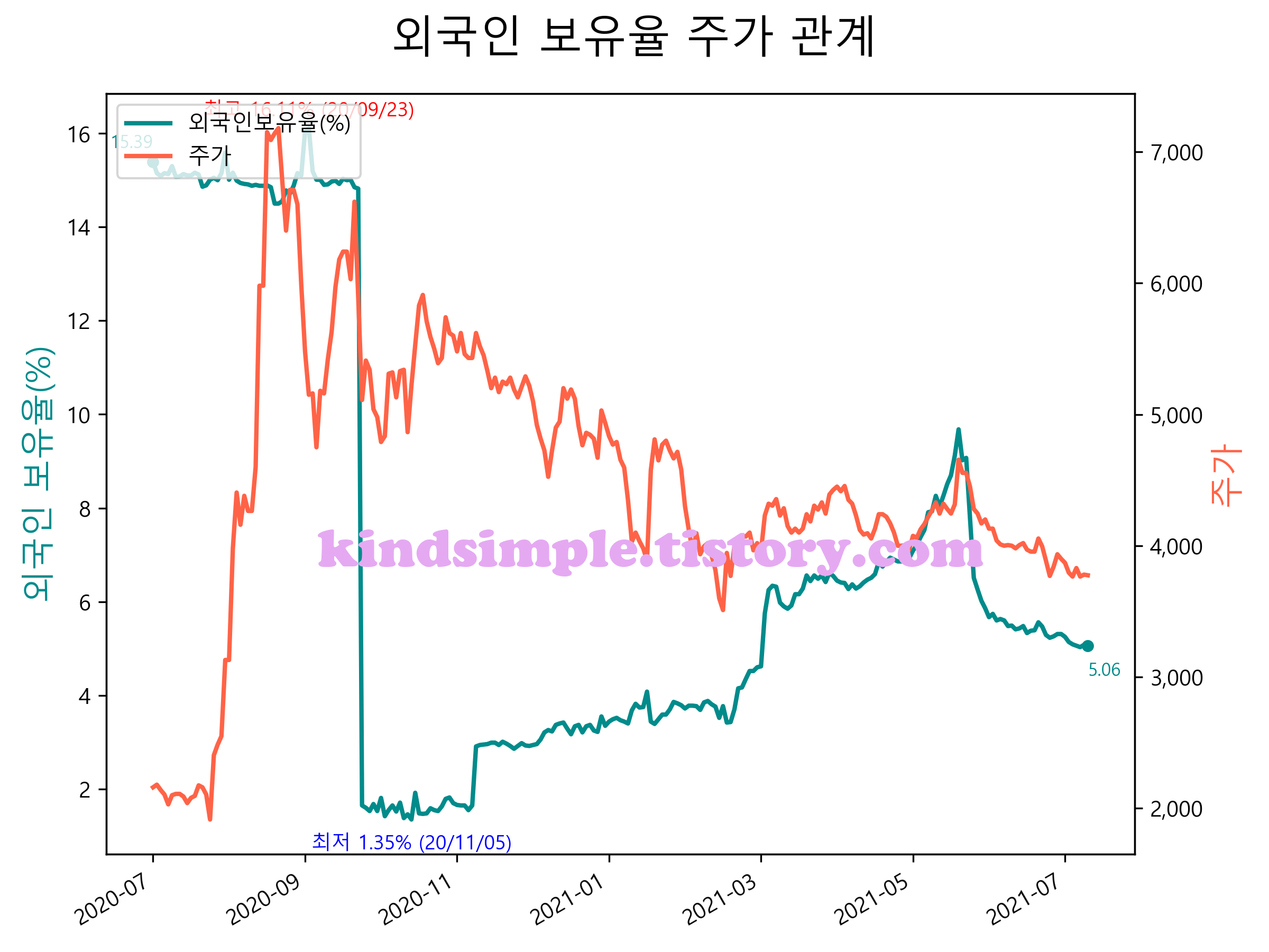 최근 1년간 외국인 보유율 및 주가와의 관계입니다.
