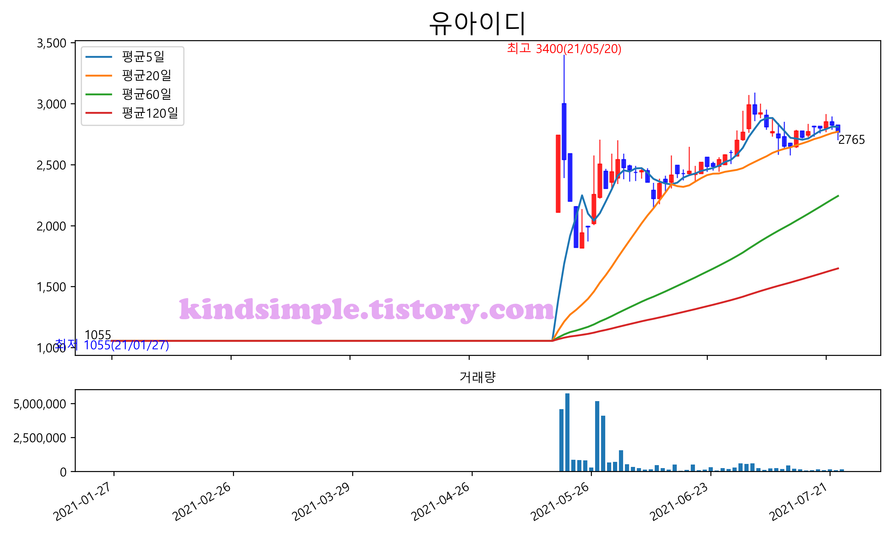 최근 6개월간 캔들차트 및 이동평균선입니다.