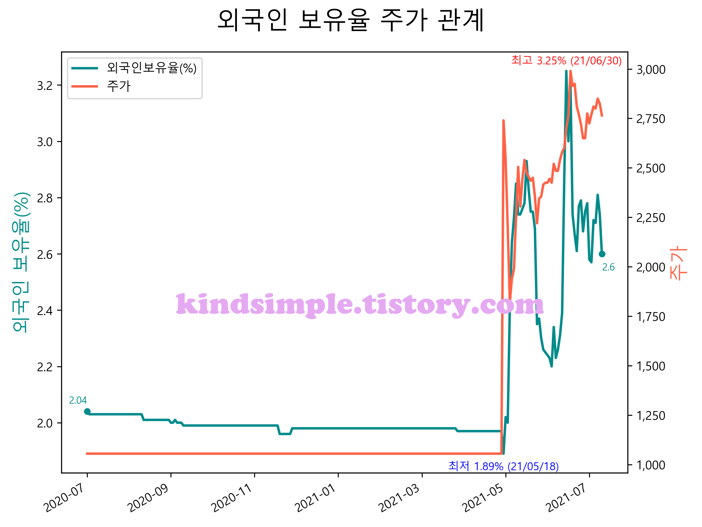 최근 1년간 외국인 보유율 및 주가와의 관계입니다.