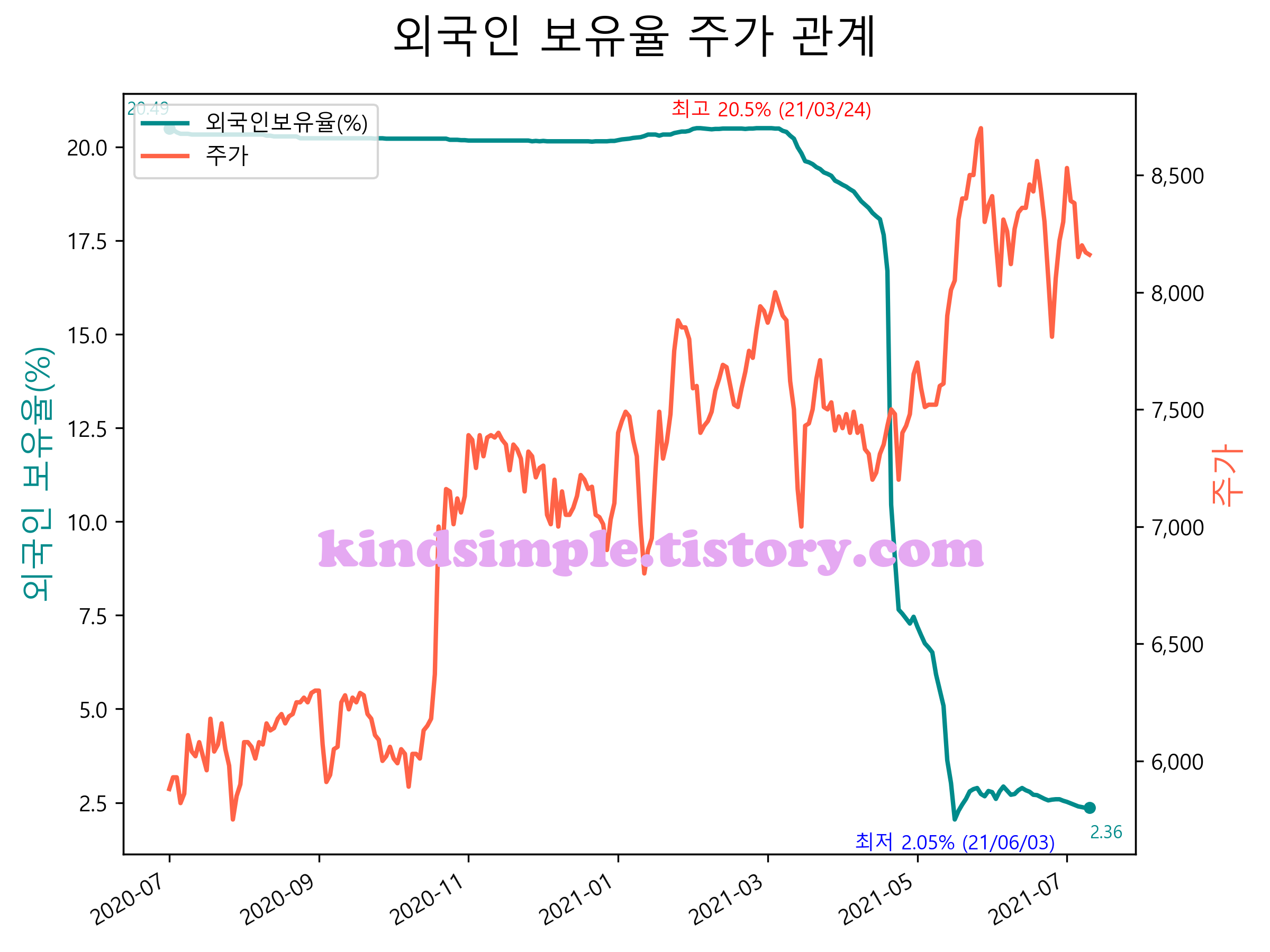 최근 1년간 외국인 보유율 및 주가와의 관계입니다.