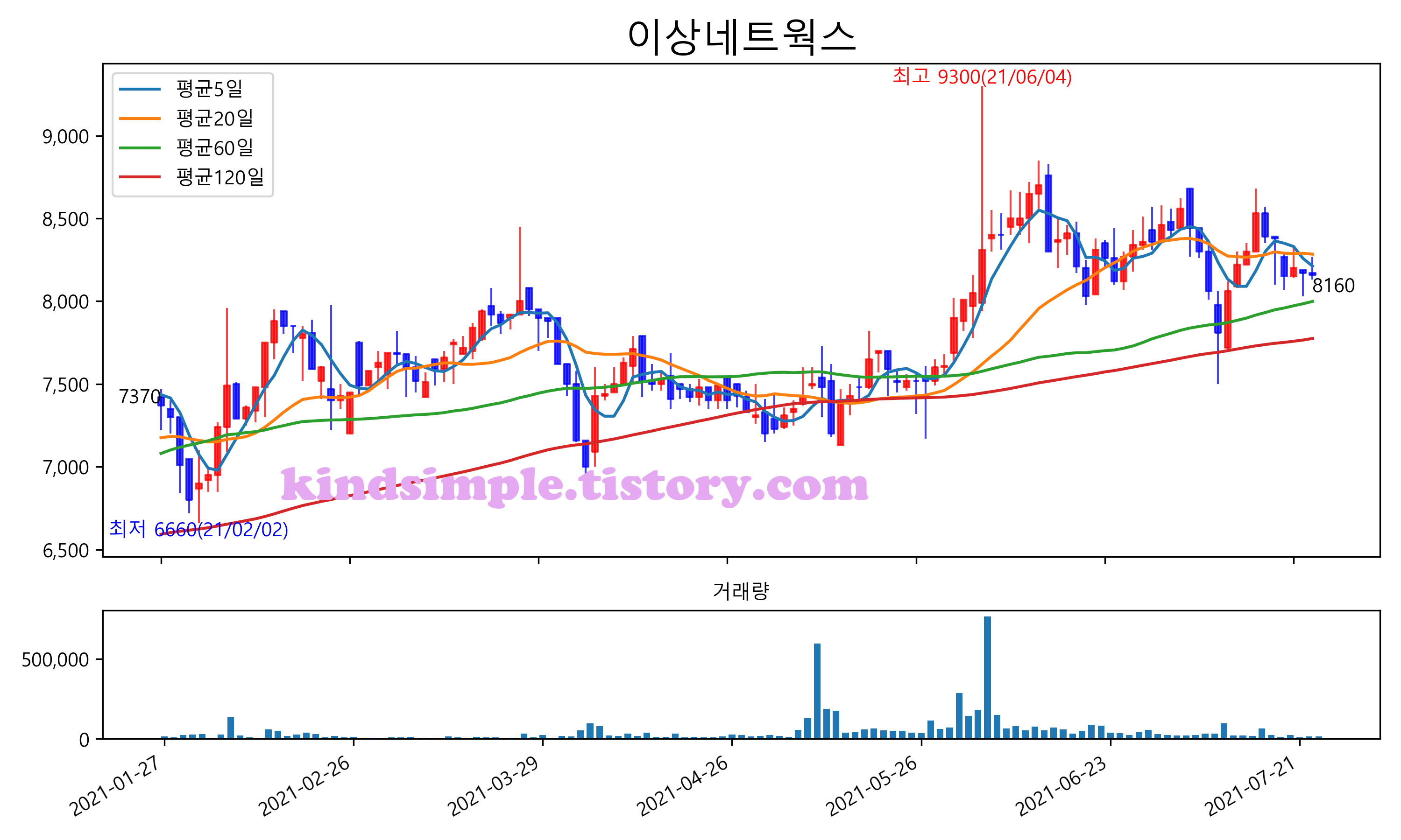 최근 6개월간 캔들차트 및 이동평균선입니다.