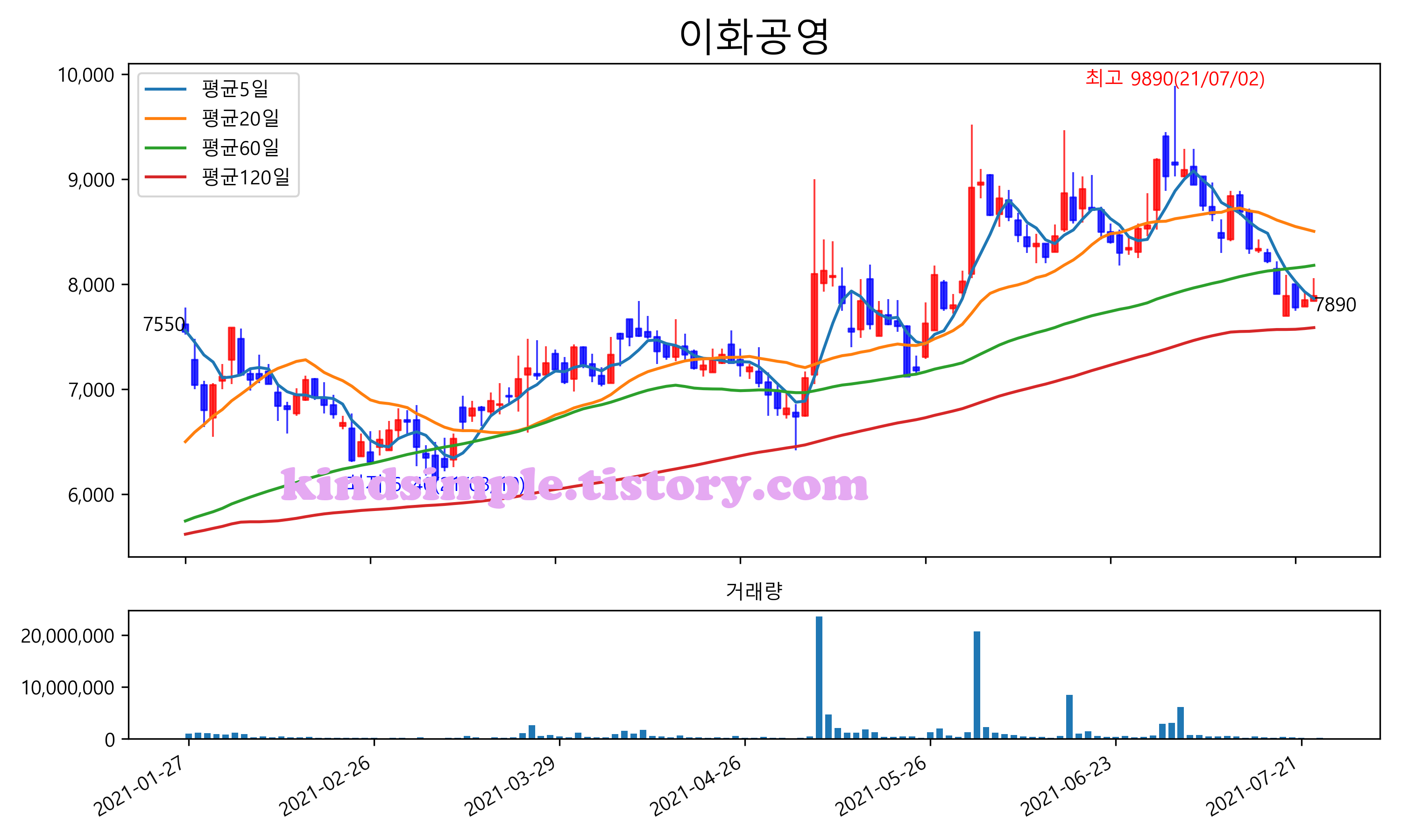 최근 6개월간 캔들차트 및 이동평균선입니다.