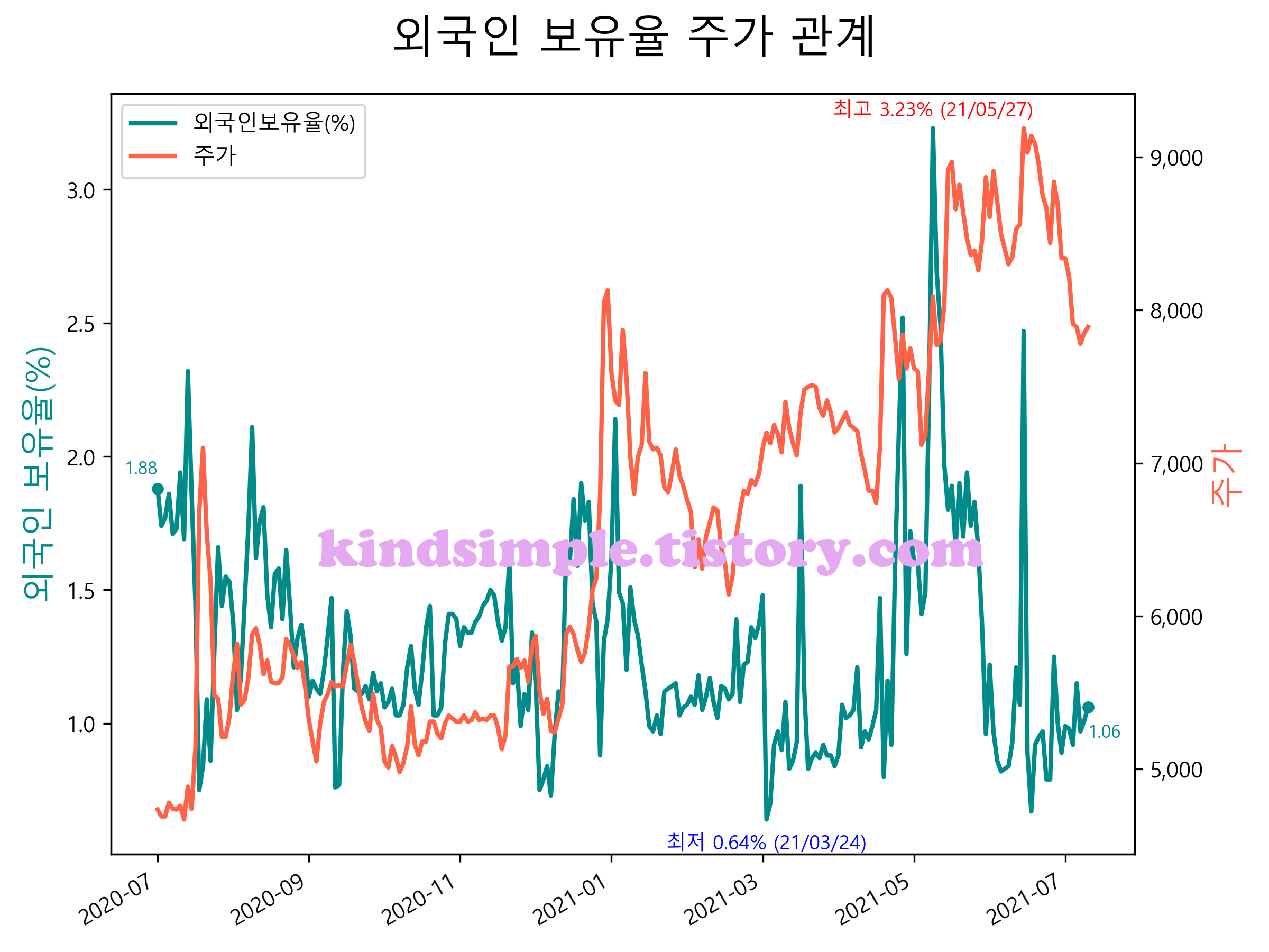최근 1년간 외국인 보유율 및 주가와의 관계입니다.