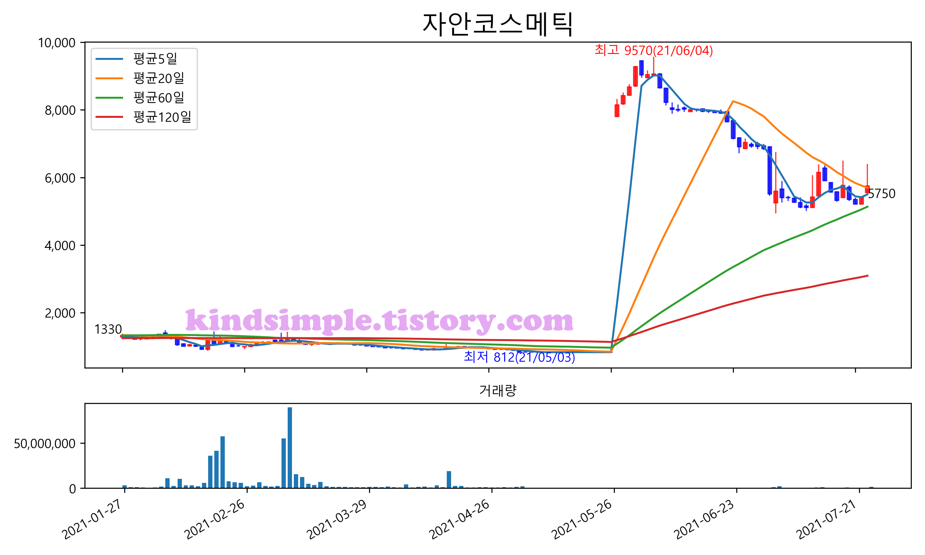 최근 6개월간 캔들차트 및 이동평균선입니다.