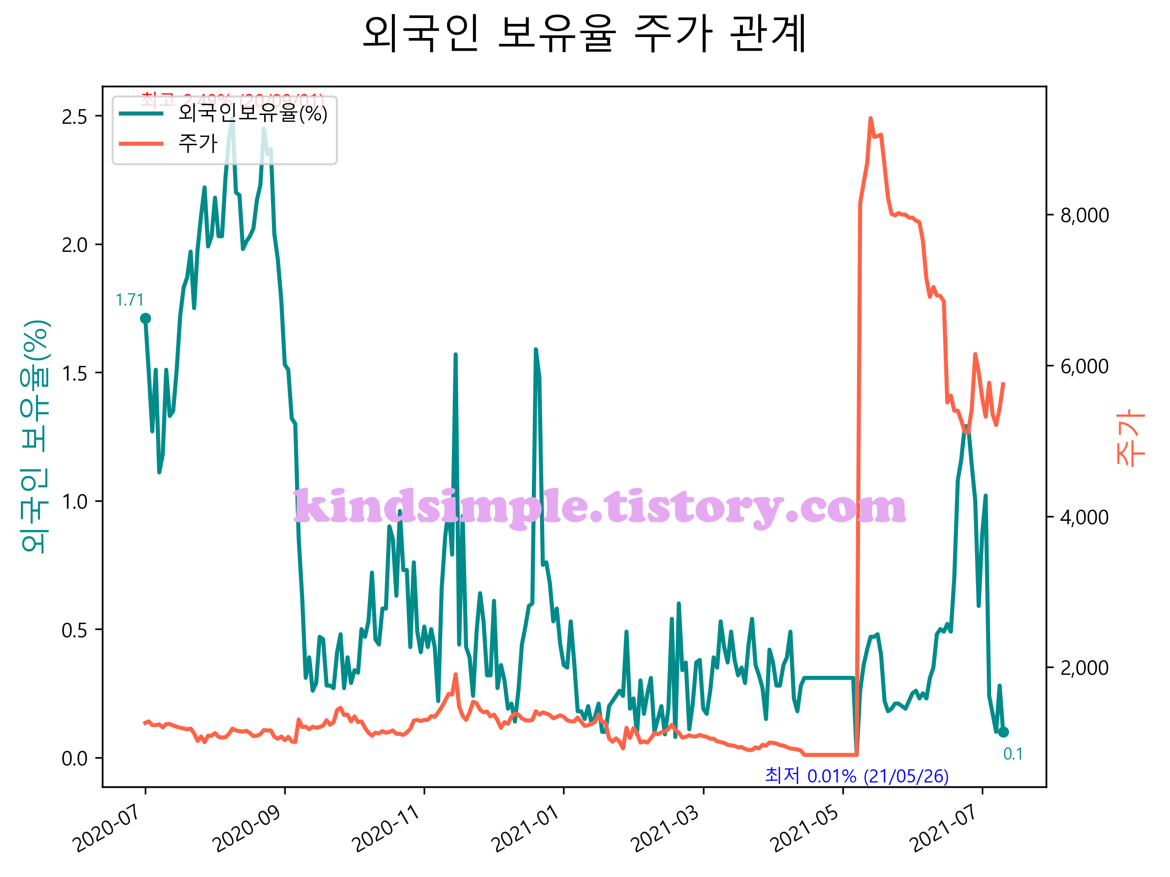 최근 1년간 외국인 보유율 및 주가와의 관계입니다.